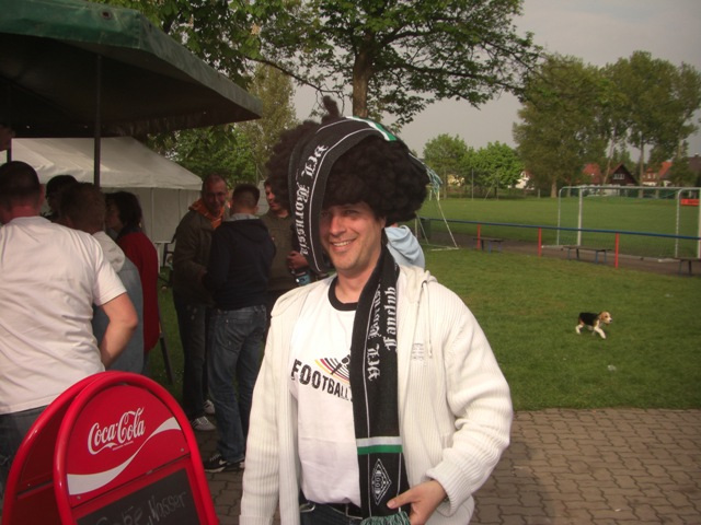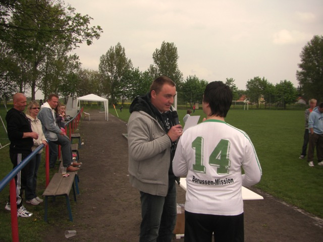In einer der zahlreichen Pausen, in denen die Kinder Torwandschießen, Reiten, Malen oder einfach der Tanzgruppe bei ihren Darbietungen zu sehen konnten, reifte der Gedanke, dass für jedes geschossene Tor der Schütze 5€ zahlen muss. Gleichzeitig sollte für jedes kassierte Tor der Torwart 5€ zahlen. Ob dies ein Grund für die fehlende Torausbeute war, kann nur gemutmaßt werden. Am Ende teilten sich Abwehrspieler B-M und Schulle die Gegentreffer, die Torschützen zahlten ihren Betrag, die Nichttorschützen gaben ebenso wie die zuschauenden Missionare etwas dazu und am Ende kam ein Betrag von 100€ zusammen. Dieser Spendenbetrag überreichten wir unserem Schiri bei der Siegerehrung. Bevor man den letzten Bundesligaspieltag verfolgte, ging es zum Duschen. Am späten Nachmittag endete die Party und dieser Tag brachte den stolzen Betrag von 1700€ zusammen.