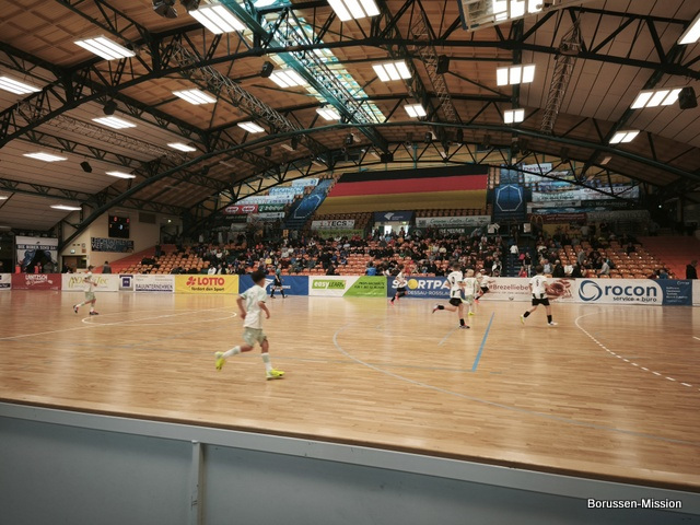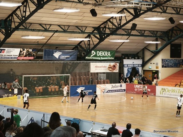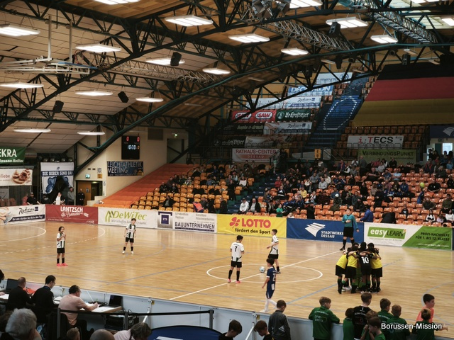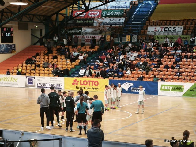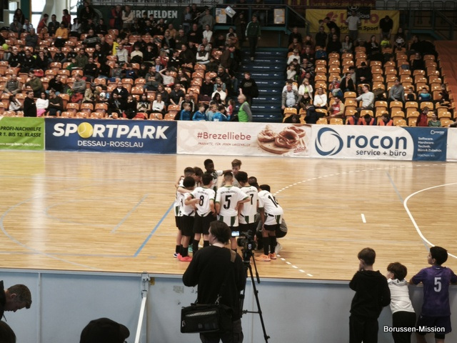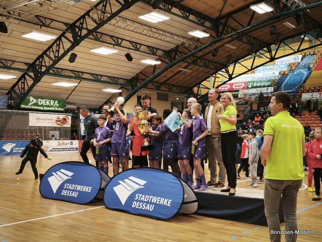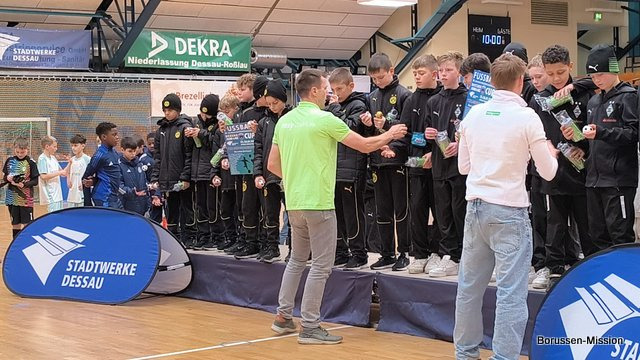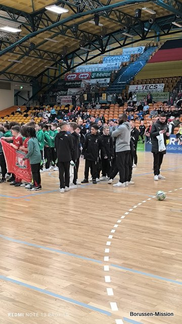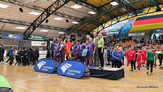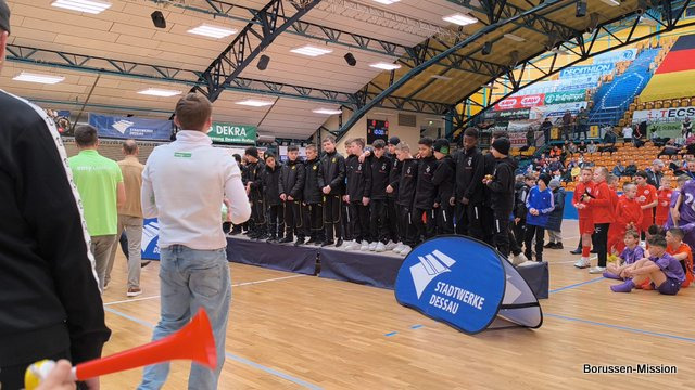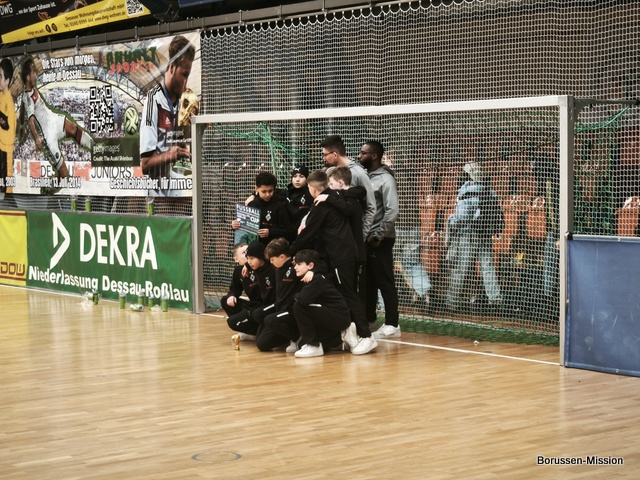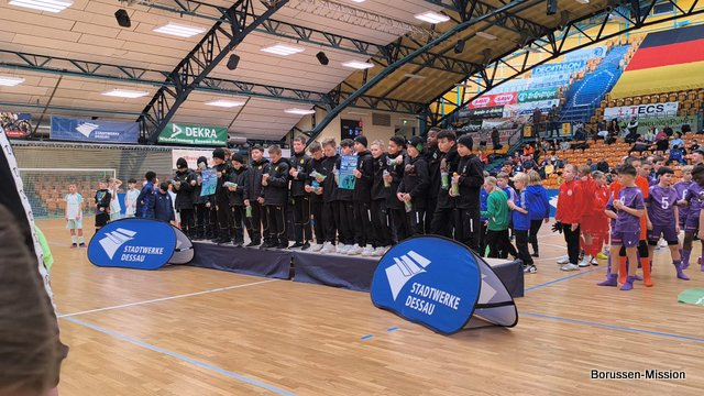 Das 31. Internationale Hallenfußballturnier der U11-Junioren startete mit 20 Mannschaften am 25.01.2025 in der Anhaltarena in Dessau. Die Gruppenauslosung ergab die Gruppe I der 4 Gruppen für die U11-Mannschaft unserer Borussia. Mönchengladbachs Jugendtrainer Dario Pichierri und Simon Ungar hatte 10 Jungs dabei. Es waren Jim Hebben, Frederick Hampel, Adis Dzeladin, Dario Abdulrahman, Leon Bondartsuk, Selim Aydemir, Elvis Bufaj, Leno Pesch, Harris Sulyman und Chidi Anakar. Zwei Wochenenden zuvor gewannen sie ein U11-Turnier mit Bundesligamannschaften in Schwäbisch Gmünd, man war gespannt, ob sie sich auch hier soweit kommen und erstmals Borussia Mönchengladbach als Cupsieger verewigt wird. Sie hatten neben der Lokalmannschaft Blau-Weiß Dessau noch Feyenoord Rotterdam, Schalke 04 und Werder Bremen in der Gruppe. Um 8:30 Uhr begann das Turnier mit dem Eröffnungsspiel der Titelverteidiger aus Rotterdam gegen Blau-Weiß Dessau. Die Jungs aus den Niederlanden gewannen mit 5:0. Das erste Spiel der Fohlen war auch gegen die Lokalmannschaft und am Ende stand ein 12:0 auf der Anzeigetafel. Es trafen jeweils dreimal Leon, Leno und Chidi, zweimal Selim und einmal Elvis, sollte es doch mit dem Cupsieg klappen? Das zweite Spiel war gegen die Jungs von Werder Bremen, die Fohlen bestimmten das Spiel und erzielten durch Adis den Führungstreffer, der leider gleich mit dem Wiederanstoß ausgeglichen wurde. Es blieb beim 1:1 Unentschieden nach 12 Minuten. Gegen die Jungs aus dem Ruhrpott von Schalke 04 taten sich die Fohlen schwer und verloren mit 3:0 das Spiel. Im letzten Spiel der Fohlen für den Samstag ging es gegen den Titelverteidiger Feyenoord Rotterdam. Am Ende trennte man sich durch die beiden Tore von Selim 2:2 Unentschieden. Als Tabellendritter war man für den Finaltag am Samstag qualifiziert. Die Jungs gingen zu ihren Gastfamilien und hatten einen schönen Abend beim Kegeln und einem Sieg der Profis gegen den VfL Bochum.