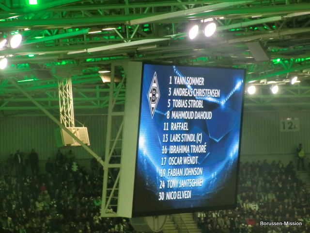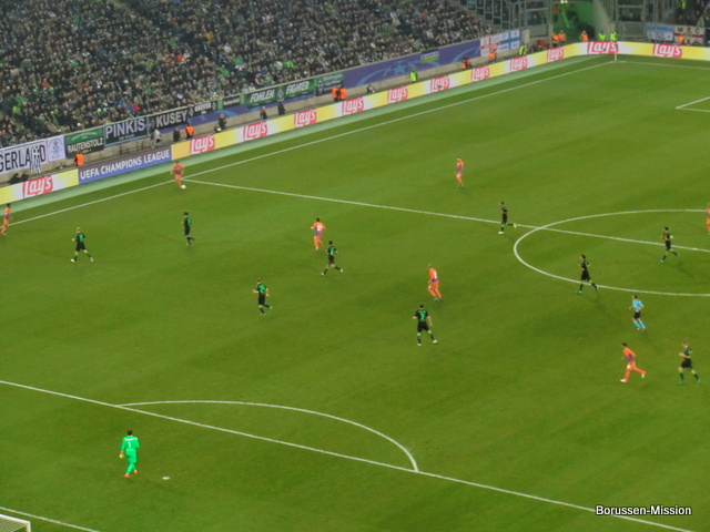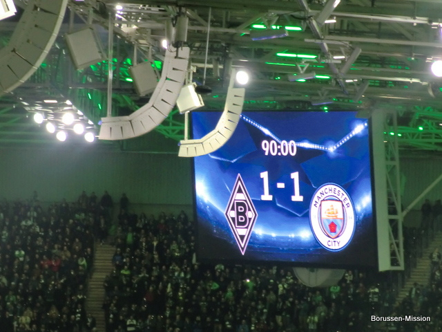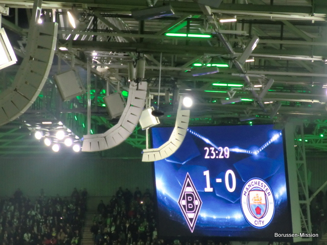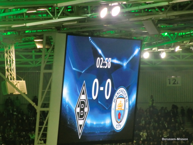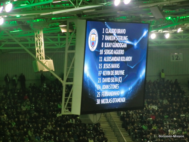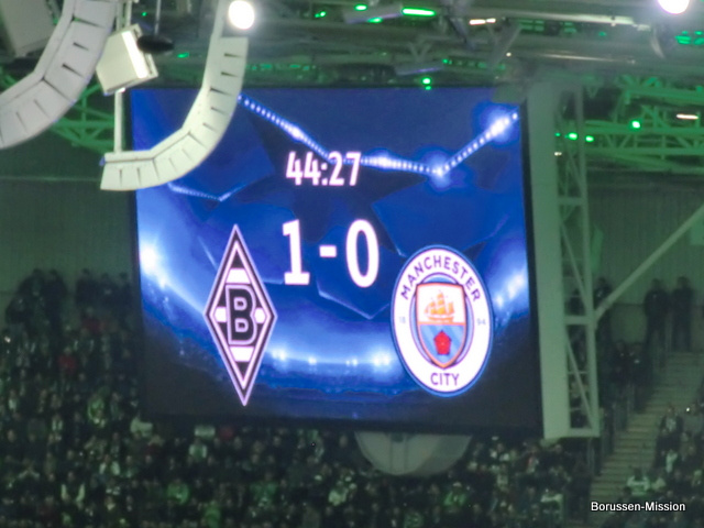 Zum Spiel: Unserem Trainer André Schubert standen durch Sperren Julian Korb und Christoph Kramer sowie aus privaten Gründen Thorgan Hazard nicht zur Verfügung. Vor Yann Sommer bildeten Nico Elvedi, Andreas Christensen, Tony Jantschke und Oscar Wendt die Abwehr, im Mittelfeld standen Ibrahima Traoré, Martin Strobl, Mo Dahoud und Fabian Johnson sowie im Angriff Lars Stindl und Raffael. Die Gäste übernahmen von Beginn an die Spielkontrolle. ManCity-Trainer Pep Guardiola ließ früh angreifen und verhinderte so einen ruhigen Spielaufbau unserer Fohlen, die aber durch lange Bälle und schnelle Konter versuchten das Tor von Barcelonas ehemaliger Nummer 1, dem chilenischen Torhüter Claudio von Bravo, zu erreichen. Die erste Chance hatte Fabian Johnson, sein Abschluss war aber kein Problem für Citys Torwart. Da die Fohlen defensiv super standen, gab es kaum Chancen für die Gäste, denen sicherlich bewusst war, dass zwar bei einem Sieg unserer Fohlen man punktgleich wäre, aber im Direktvergleich unsere Borussen mit 5 Toren Unterschied gewinnen musste, da das Hinspiel 4:0 für ManCity endete, folglich eine Utopie gegen diese Mannschaft. Jedoch fiel in der 23 Minuten der Führungstreffer für unsere Fohlen als sich Lars Stindl auf der linken Seite gegen Otamendi durchsetzte und den Ball im Strafraum zurück auf Raffael legte. Unser Brasilianer ließ sich nicht zweimal bitten und zirkelte das Leder aus 15 Metern zum 1:0. Im Borussiapark brach Jubel aus, aber manche erinnerten sich auch an die Spiele gegen ManCity ein Jahr zuvor. In beiden Spielen in der Champions League Gruppenphase schafften damals unsere Fohlen den Führungstreffer. Im Heimspiel verlor man am Ende Unglücklich das Spiel durch einen Elfmeter und im Auswärtsspiel ging es mit einer 2:1 Führung zur Halbzeitpause, aber 10 Minuten vor Schluss reichten fünf Minuten in denen die Citizen das Spiel drehten und man noch 4:2 verlor. Die Gäste hatten ihre erste nennenswerte Chance nach einer Ecke. Der ehemalige BVB-Spieler Gündogan kam unbedrängt zum Schuss, den Yann Sommer mit einer starken Parade abwehrte. Auf der anderen Seite startete Oscar Wendt nach einem frühen Ballgewinn zu einem starken Solo, scheiterte aber aus ungünstigen Winkel an Bravo. Wenig später musste André Schubert Ibrahima Traoré wegen einer Muskelverletzung auswechseln und brachte für ihn Jonas Hofmann. Als sich schon viele Borussen auf die Halbzeitpause freuten, schlugen die Engländer zu. Die letzten Minuten vor der Pause gehörten den Gästen. Zunächst verpasste Aguero noch den Ausgleich, wobei Yann Sommer stark reagierte, aber in der Nachspielzeit passte Sterling auf De Bruyne im Strafraum, dessen Querpass zu Silva gelang, wo dieser im Fünfer nur noch den Fuß zum Ausgleich hinhielt. Der Borussiapark war geschockt und mit dem Ergebnis ging es in die Halbzeitpause.