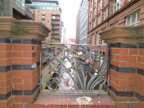 Nach der Stärkung ging es problemlos weiter in die Stadt, dessen Einwohner Mancunians genannt werden. Im Jahr 79 ließ der römische Feldherr Gnaeus Julius Agricola am Zusammenfluss des Irwell und des Medlock ein Kastell errichten. Es wurde Mamucium genannt, das lateinische Wort für „brustförmiger Hügel“. Der Wortteil chester erinnert auch an die römische Zeit und bedeutet Lager. Nachdem die Römer im Jahr 407 Großbritannien verlassen hatten, blieb die Gegend lange Zeit unbewohnt, bis im 7. Jahrhundert die Angelsachsen sich dort niederließen, wobei diese antiken Sachsen nicht zu verwechseln sind mit den späteren Sachsen des Hochmittelalters und den Bewohnern des heutigen Bundeslandes Sachsen. Sie gründeten ein Dorf mit dem Namen Mameceaster, woraus sich dann Manchester entwickelte. Das kleine Dorf Manchester stieg im 13. Jahrhundert zu einer Marktsiedlung auf und erhielt schon im Jahre 1222 das Recht einen Markt zu haben. Im 14. Jahrhundert wanderten Flandern nach Manchester und ließen sich dort nieder, sie begründeten die Tradition der Wollverarbeitung und Leinenherstellung. Manchester erlebte dadurch eine Blütezeit und spielte eine Schlüsselrolle während der Zeit der Industriellen Revolution. Die zahlreichen Bäche, die in den Pennines nördlich und östlich der Stadt entsprangen, waren ideal für die Errichtung von Baumwollspinnereien, die durch Wasserkraft angetrieben wurden. Die Eröffnung des Bridgewater-Kanals 1761, der von den Kohlegruben des Duke of Bridgewater in Worsley bis nach Manchester führte, stellte einen Verkehrsweg zur Verfügung, der für den sicheren und preiswerten Transport von Kohle für die Dampfmaschinen und Haushalte in Manchester und für den Abtransport von Fabrikgütern aus Manchester sorgte. Er verläuft ohne jegliche Schleusen auf einem Niveau. Die meisten Arbeiter wurden zu Hungerlöhnen angestellt und mussten in erbärmlichen Zuständen leben, obwohl die blühende Textilindustrie zu einer Expansion der Stadt und zur Bildung eines breiten Vorortgürtels führte. Die Weltwirtschaftskrise 1929 traf die Stadt hart, da die Textilindustrie bis zur Bedeutungslosigkeit herab sank und sich die Wirtschaftsstruktur änderte. Manchester übernahm eine Führungsrolle in der Informatik, da der „Vater“ der modernen Computer, Alan Turing, an der Universität Manchester lehrte. Am 15. Juni 1996 explodierten hunderte Kilogramm Sprengstoff im Zentrum Manchesters, aber durch eine vorherige Warnung kamen glücklicherweise keine Menschen ums Leben. Als Folge der Wiederaufbaumaßnahmen und einer günstigen Wirtschaftsentwicklung hat die gesamte Innenstadt Manchesters in den letzten Jahren einen bedeutenden Aufschwung erfahren. Das Stadtbild wird heutzutage durch Kaufhäuser der gehobenen Klasse sowie Luxuswohnungen und futuristische Architektur mitgeprägt. Der tiefgreifende Strukturwandel hat in der städtischen Wirtschafts- und Sozialstruktur tiefe Spuren hinterlassen, hier findet man sowohl sehr wohlhabende als auch die ärmsten Haushalte Großbritanniens. Davon machten sich die Borussen selbst ein Bild, aber erst nachdem die Hotelbar besucht und man ausgehfertig fürs Champions League Spiel war. Wenige bemerkten, dass sie Quartier gegenüber eines der früher international bekanntesten Clubs der Stadt, dem “Fac 51 Hacienda” bezogen. Der Club eröffnete 1982 und bestand bis 1997. Heute befinden sich dort Luxusappartements und nur kleine Schriftzüge erinnern noch daran. Die meisten Borussen liefen zum Treffpunkt für den Bannermarsch zum Stadion, aber nicht ohne vorher ein paar britische Bier und Speisen zu sich genommen zu haben. Die Preise auf dem Manchester Weihnachtsmarkt luden jedenfalls nicht zum Verweilen ein und so waren die Lokale rund um den Piccadilly Garden überfüllt. Irgendwo traf man auch die Missionare, die schon länger in der Stadt waren und die die beiden Stadion in Liverpool sowie das Old Trafford Stadion besucht hatten.