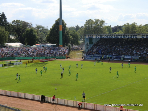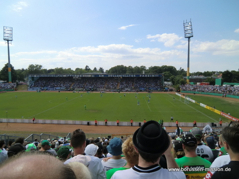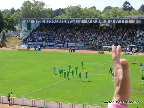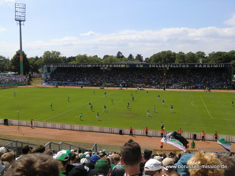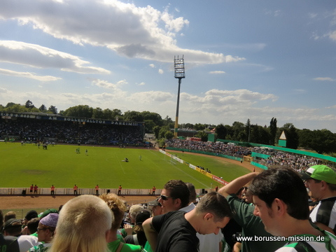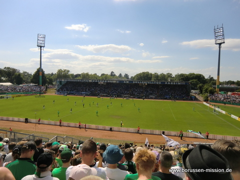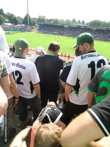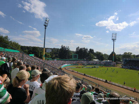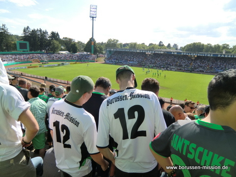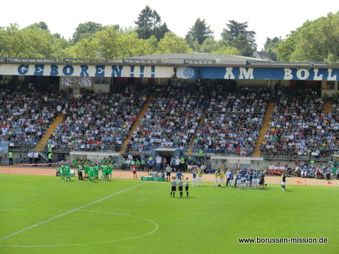Die Losfee Nia Künzer bescherte unseren Fohlen ein Gastspiel in Darmstadt. Der Ursprung des Stadtnamens ist unklar. Die älteste Erwähnung  unter der Bezeichnung Darmundestat ist bereits aus dem 11.Jahrhundert. Heute zählt sie mit der Stadtregion über 400 000 Einwohner und ist die viertgrößte hessische Stadt. Eine Städtepartnerschaft besteht mit dem sächsischen Freiberg und im Stadtwappen befindet sich ein Löwe über einer blauen Lilie. Dieser Löwe ist das Wappentier der Grafen von Katzenelnbogen und die Lilie könnte die Gottesmutter Maria versinnbildlichen. Das Wappen mit Löwen und der Lilie existiert schon seit dem 15.Jahrhundert. Als Lilien bezeichnen sich auch die Spieler und Fans des SV Darmstadt, die eine Lilie auch im Logo des Vereins tragen. Der Verein gehört zu den ältesten deutschen Fußballvereinen und spielt seit 1921 im Stadion am Böllenfalltor. Als Böllen werden Pappeln bezeichnet, die für den Stadionbau weichen mussten. Die Stadt erließ daraufhin eine Anordnung, dass die verschonten Böllen nicht gefällt werden dürfen und der Verein übernahm die Patenschaft für diese. Das Stadion befindet sich in der Nähe eines Waldgebietes und erinnert durch seinen Aufbau an den guten alten Bökelberg. So ist nur die Haupttribüne überdacht und zu den Stehplätzen geht es ein paar Stufen hinauf. Dieses alt ehrwürdige Stadion wollten sich nur ein paar wenige Missionare nicht entgehen lassen und so reisten sie separat an. Dan und Schöni fuhren bereits am Samstag zu Patte nach Karlsruhe, feierten das Wiedersehen dort ausgiebig und hatten am Spieltag so nur noch eine kurze Anreise. Sie trafen Vegas mit Frau und Freunde vorm, die Ränzelstecher und Timo im Stadion. Bei über 30°C im Schatten suchte alle vergeblich ein schattiges Plätzchen im Block, auch gab es in den wenigen mobilen Toiletten kein Wasser zum Erfrischen. Das Banner wurde angebracht und viele hofften auf ein tolles Spiel und keine Verlängerung.