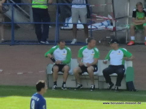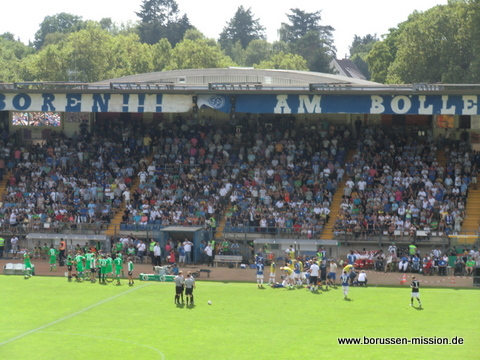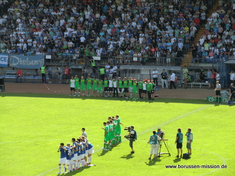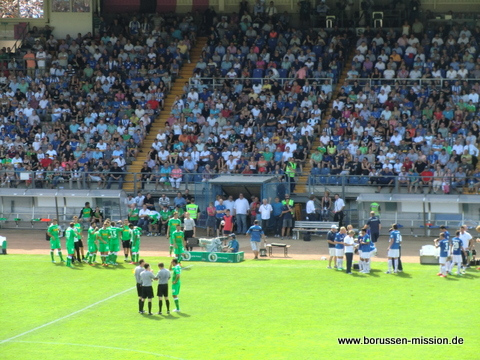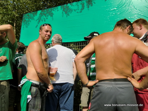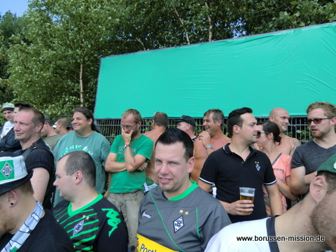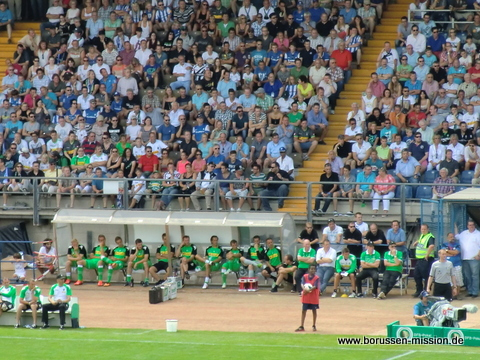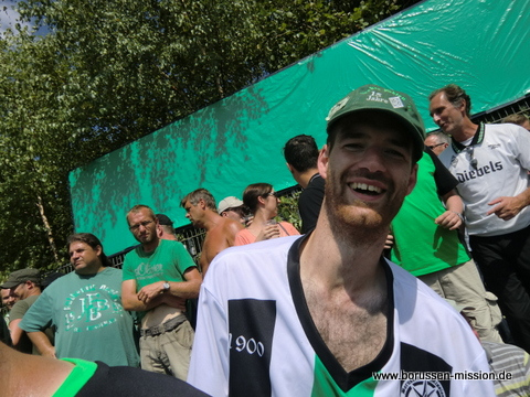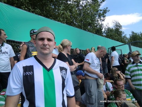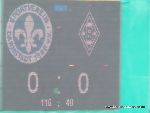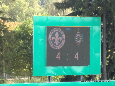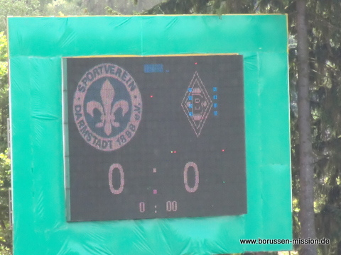 Zum Spiel: Unser Trainer Lucien Favre schickte hier die Elf ins Rennen, die beim Testspiel in Glasgow begann. Einzig ausgetauscht wurde verletztungsbedingt Amin Younes, ihn ersetzte Branimir Hrgota. Lucien ließ bei sommerlichen Temperaturen alle drei Neuzugänge beim Drittligisten dessen  Fanchoreographie vom Platz aus bewundern. Unsere Fohlen hatten in der ersten Hälfte viel Ballbesitz, jedoch fehlten Ideen, den tief stehenden und auf Konter lauernden Gastgeber und die Zuschauer zu überraschen. Bis an den Strafraum lief die Pille gut, aber ein Torschuss fiel weder vor der Spielunterbrechung zwecks Getränkezufuhr noch vor der Halbzeitpause. Die Gastgeber waren da schon gefährlicher und so konnte MAtS das Spielgerät nach einer Standardsituation gerade noch ans Aluminium lenken. Ein Lupfer von Neuzugang Max Kruse aufs Tornetz war der einzige Höhepunkt für uns. Wer in der Halbzeit sich mit Wasser erfrischen wollte, wurde im Gästebereich enttäuscht. Wie bereits erwähnt, gab es auf den Toiletten kein Wasser und als Getränk vom Bierwagen zu dieser Zeit auch nicht mehr. Im schattenlosen Stadion konnte solch eine Planung niemand verstehen, denn solch eine Wetterlage war bekannt. Bei Temperaturen über 30 Grad im Schatten stöhnten folglich viele Borussen und konsumierten das kühle Pfungstädter Bier. Nach der Pause änderte sich leider kaum etwas. Zwei Schüsse auf Darmstadts Tormann Zimmermann von Max Kruse bereits vor der zweiten Spielunterbrechung zwecks Getränkezufuhr waren da noch die Höhepunkte. Die Gastgeber blieben weiter gefährlich und so rettet in der zweiten Halbzeit Martin Stranzl kurz vor der Torlinie und einmal wurde zu unserer Freude das Abseitstor nicht gewertet.
