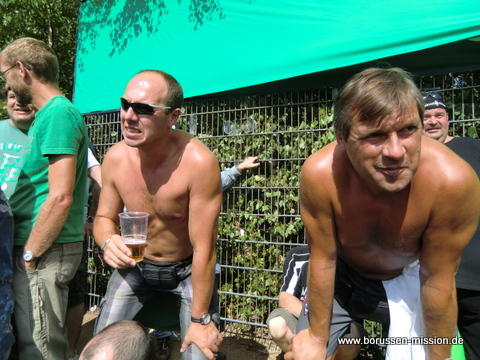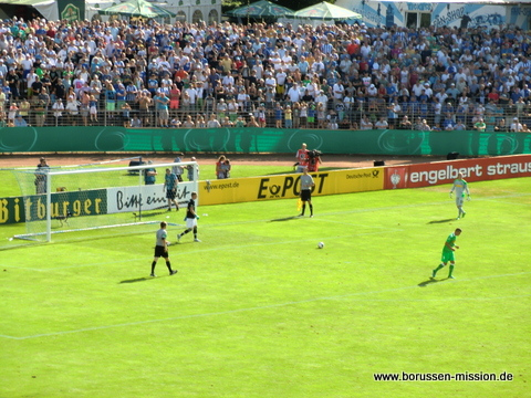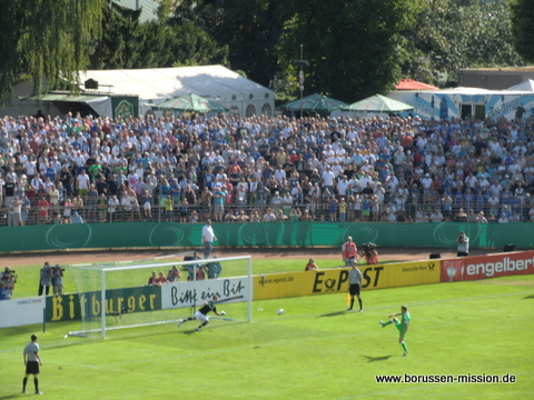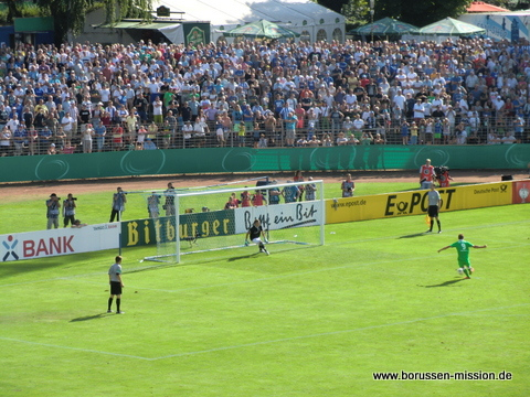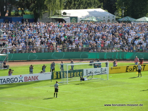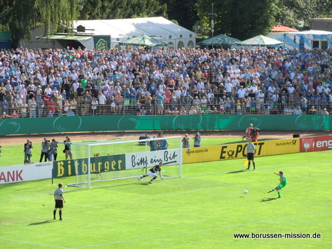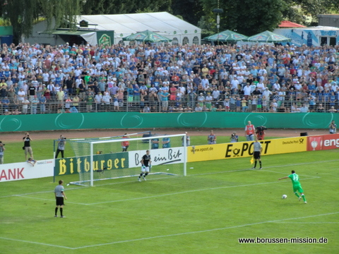 Es folgte das Elfmeterschießen und die Gastgeber begannen. Für die Lilien traf Sulu und Filip Daems glich aus. Der Darmstädter Sailer legte wieder vor und Luuk de Jong scheiterte an Zimmermann – Vorteil für den Drittligisten. Anschließend trafen da Costa und Stegmayer für die Lilien und Granit Xhaka und Max Kruse für die Fohlen. Darmstadts letzter Schütze Stroh-Engel scheiterte an Marc Andre ter Stegen und im Block keimte Hoffnung auf. Als Martin Stranzl ausglich, dachten viele Borussen an die Wendung und das Erreichen der zweiten Runde. Der Darmstädter Ivana aber legte wieder vor und als Branimir Hrgota den Ball an die Latte lupfte und dieser von da zurück ins Spielfeld fiel, war das Ausscheiden amtlich. Die Hausherren entschieden das Elfmeterschießen 5:4 für sich und bleiben im DFB-Pokal während unsere Fohlen ausschieden.