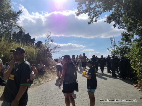 Im Block war die Enttäuschung zu spüren und viele Borussen waren entsetzt als wenig später einige Jungs aus unserem Block auf dem Spielfeld standen und ihre Wut an Werbebanner ausließen. Kurz darauf rückten die Ordnungshüter in schwarz in den Block und eine ungewohnt aggressive Stimmung war zu spüren. Den Weg vom Stadion über das Waldstück zum Reisegefährt säumten dann viele Ordnungshüter, einige hoch zu Ross, andere mit Hunden. Sollte hier noch etwas passieren oder warum waren es so viele? Man dachte nicht weiter drüber nach, schließlich lagen noch über 400 Kilometer Heimreise vor uns. Die Heimfahrt verlief problemlos und die Behinderungen durch Unwetter konnten durch neue Ausweichstrecken umfahren werden. Vor Mitternacht waren die Missionare wieder zu Hause.