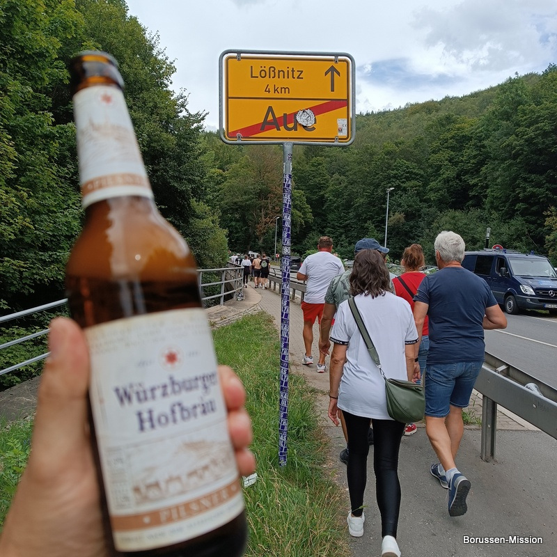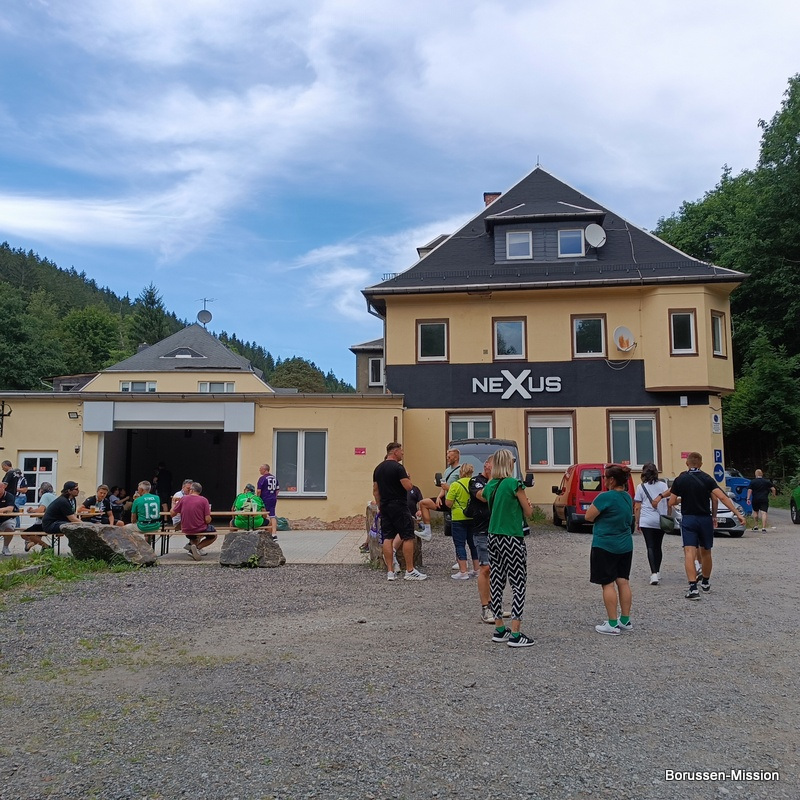 Zu diesem Spiel ging es individuell bzw. reisten die meisten Missionare mit dem Auto an. Eine Reisegruppe startete in Halle an der Saale. Um dorthin zu gelangen, radelte ein Missionar zu seinem Ortsbahnhof, nahm von dort aus den Zug und schaffte trotz Verspätung und Gleiswechsel noch den Anschluss. Pünktlich wartete in Halle das Auto zur Weiterreise und bevor die weiteren Mitfahrer im Burgenlandkreis eingesammelt werden konnten, kam ein Pannenhilferuf. Natürlich halfen sie, am Ende lag man durch die Hilfe etwas in Zeitverzug. Am letzten Treff gab es trotzdem ein kleines Päuschen bevor es in Richtung Erzgebirge ging. Nach einer guten Viertelstunde Autofahrt, stellten man fest, dass ein Handy fehlt und es sich nicht im Auto befand. Dank möglicher Ortung konnte es lokalisiert werden. Es befand sich unweit des letzten Zustieg. Da man noch etwas Zeit bis zum Anpfiff hatte, entschied man sich zur Umkehr. An den Zielkoords schwärmten die Borussen aus und fanden das corpus delicti. Glücklich konnte nun die Reise ins Lößnitztal fortgesetzt werden. Um nicht länger vor Ort im Stau zu stehen, wurde ein Parkplatz organisiert und per pedes der letzte Kilometer zurückgelegt. Vor und im Stadion traf man viele befreundete Borussen und den Schal zum Spieltag von de Ultras „Borussiafans, immer überall“ erwarb man natürlich auch. Die Fahne fand ein Plätzchen und pünktlich begann das Spiel. Das Tor der Heimmannschaft hütet wieder Martin Männel, wie vor 14 Jahren. Man war gespannt auf den Ausgang.