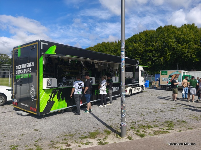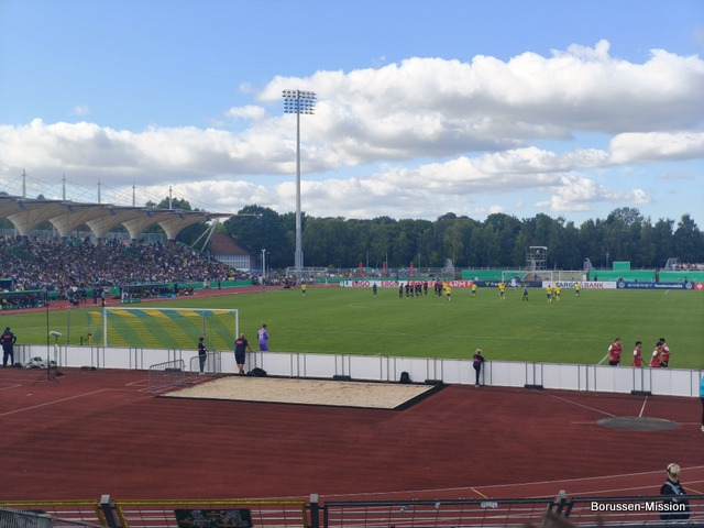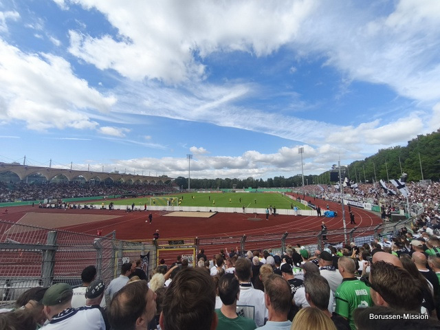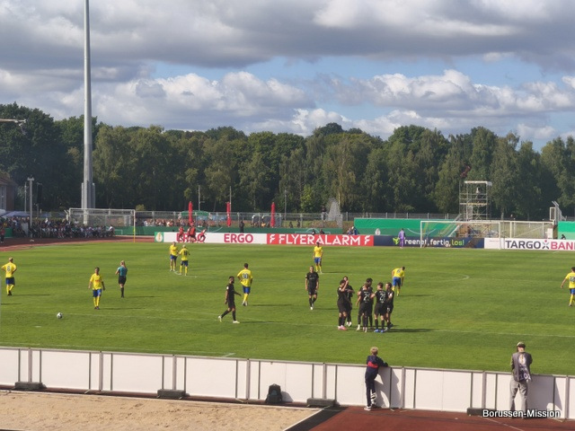 Bei hochsommerlichen Temperaturen erspielten sich die Fohlen viele Großchancen, die sie aber nicht nutzten. Die Hausherren versteckten sich aber auch nicht und versuchten über Konterchancen zum Treffer zu kommen. In der zwanzigsten Minuten war es endlich für die Fohlen soweit. Ein schnell ausgeführter Freistoß um den Mittelkreis brachte am Ende den ersten Treffer des Spiels durch einen Lupfer von Robin Hack. Etwa nach einer halben Stunde hätte es einen Strafstoß für die Fohlen nach einem Foul an Rocco Reitz geben müssen, aber der Pfiff von Schiedsrichterin Fabienne Michel blieb aus. Fast im Gegenzug traf der Delmenhorster Rohwedder freistehend von der Strafraumgrenze zum Ausgleich. Wo war da unsere Abwehr? Etwa fünf Minuten nach dem Ausgleich umspielte Kevin Stöger einige Gegenspieler auf dem Weg zum Strafraum und spielte auf Robin Hack ab. Dieser nutzte die Chance und traf zur erneuten Führung. Wenig später versuchten es die Delmenhorster erneut aus der Distanz und Linus Urban traf aus etwa dreißig Metern zum Ausgleich. Damit ging es in die Halbzeitpause.