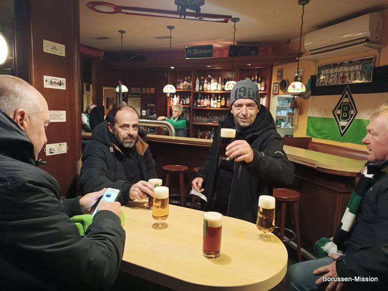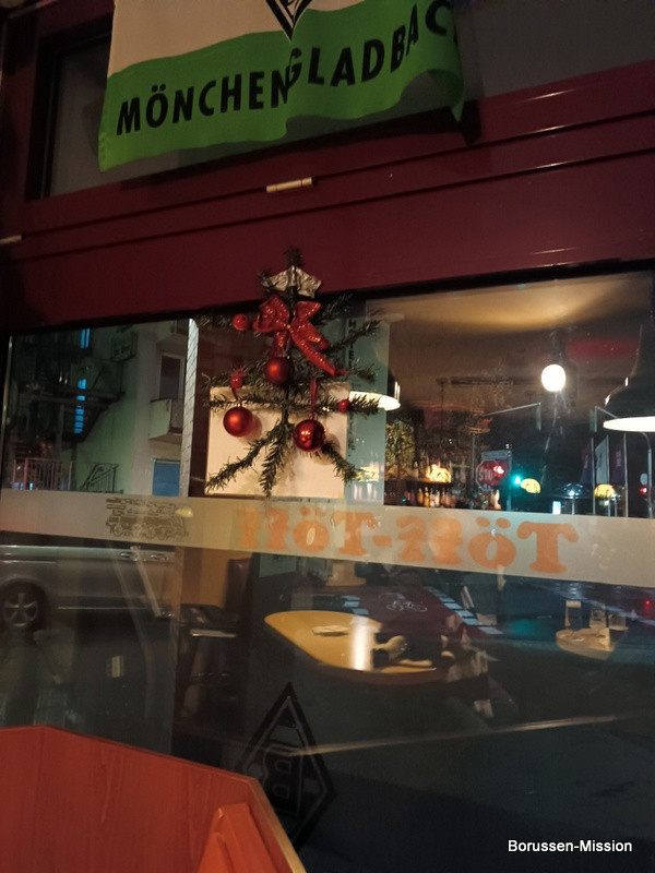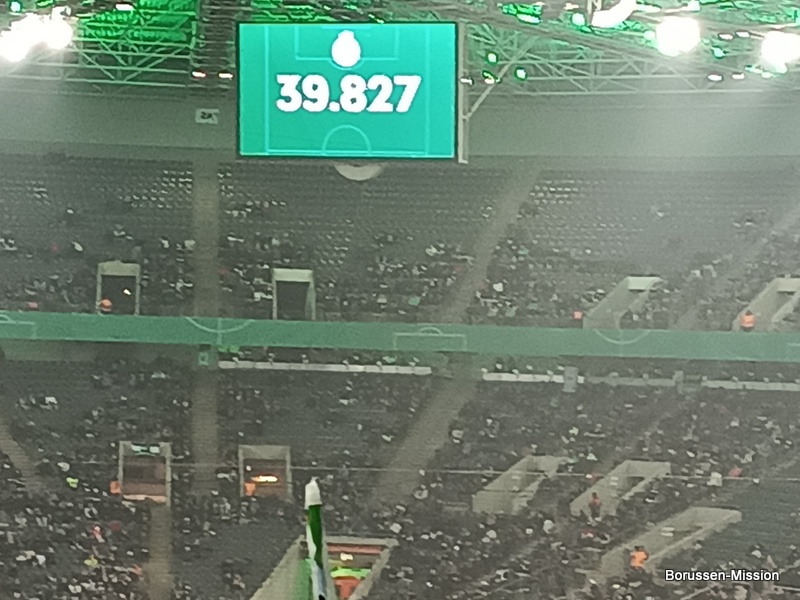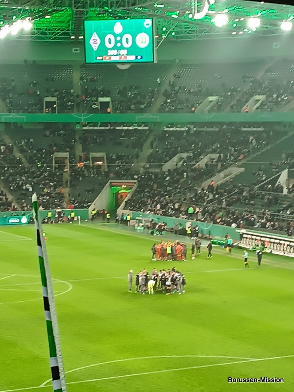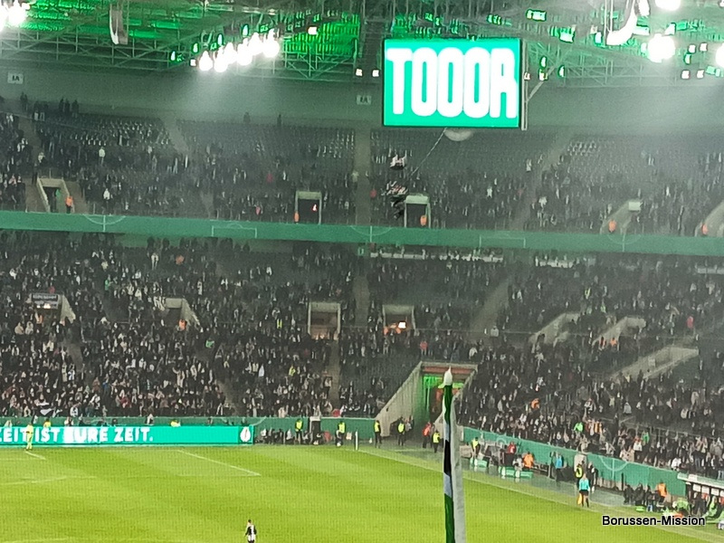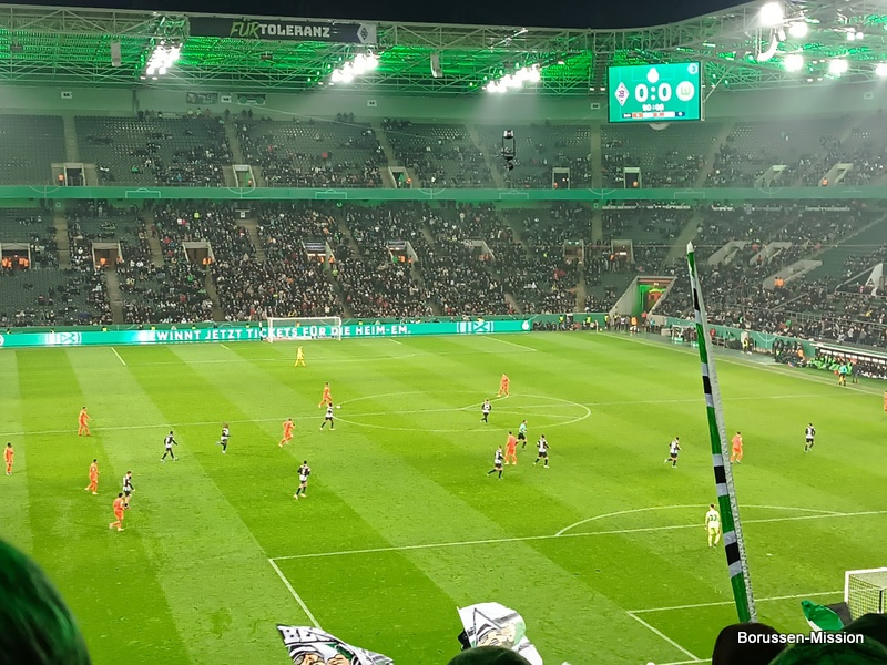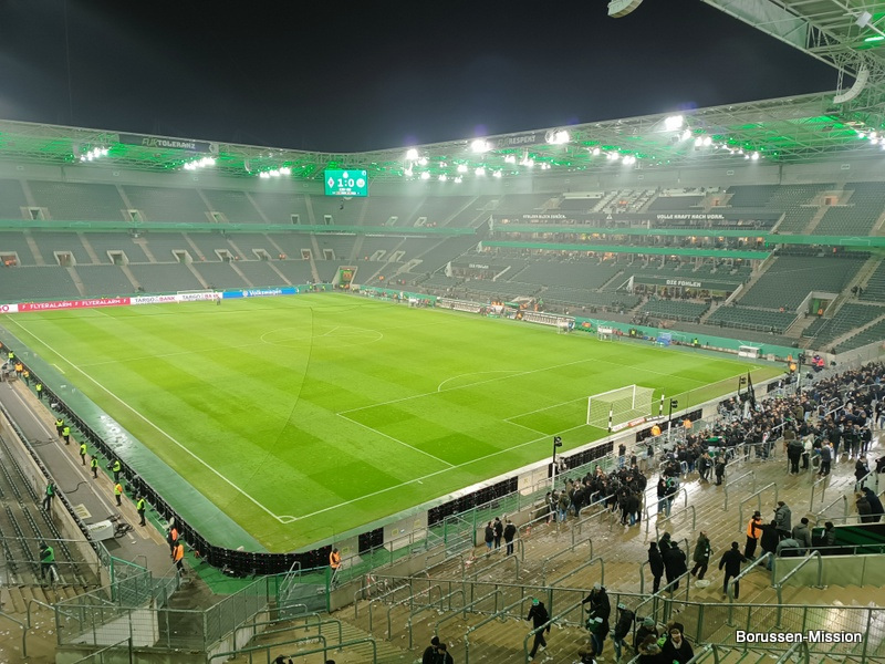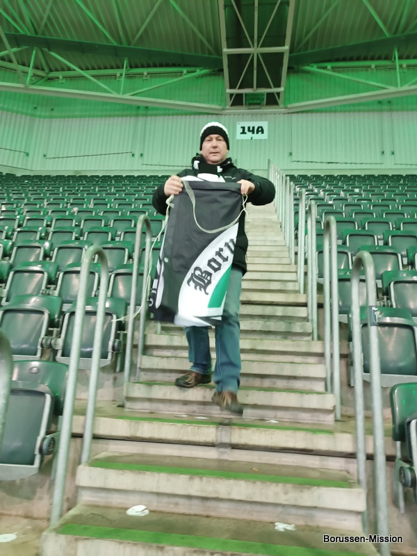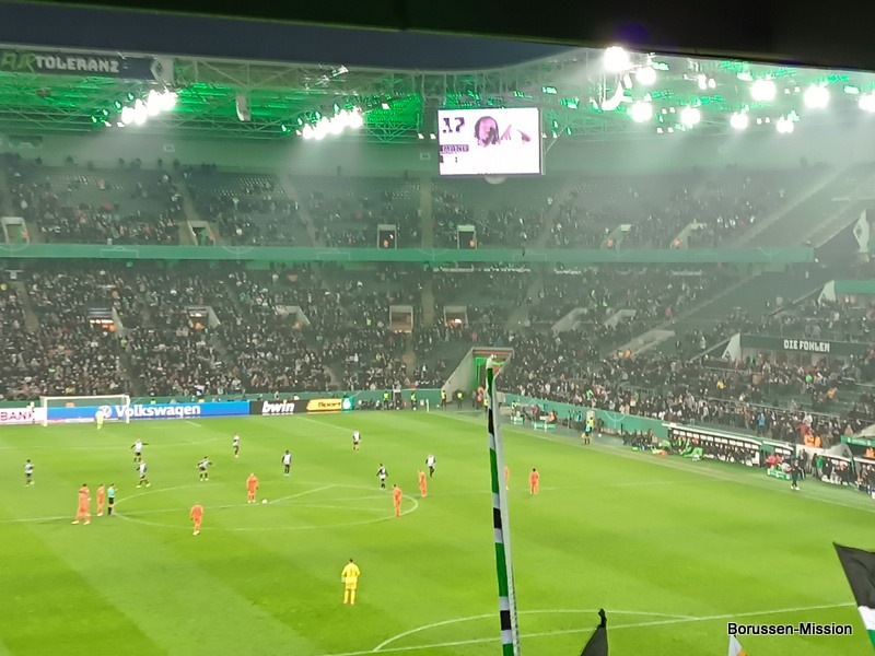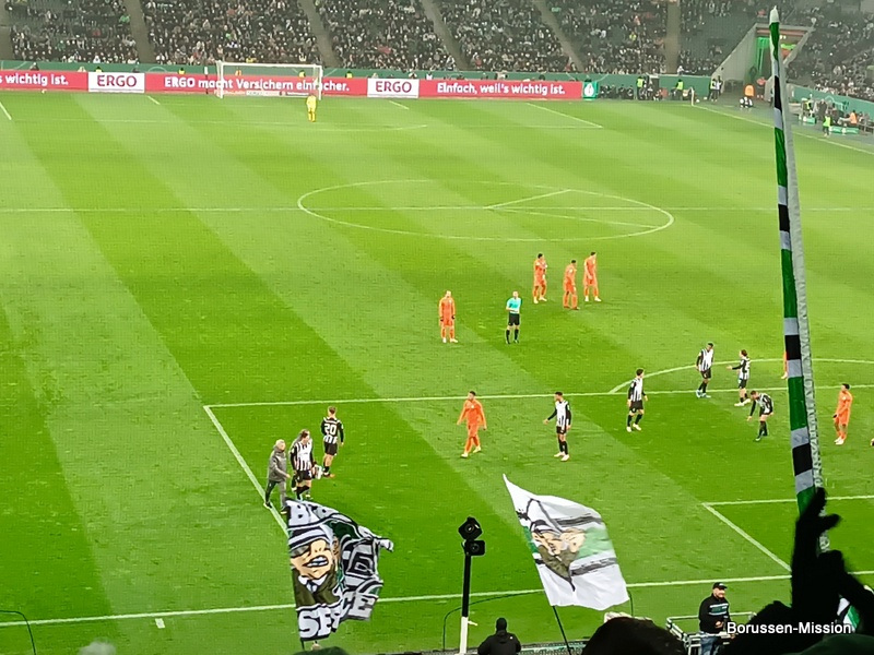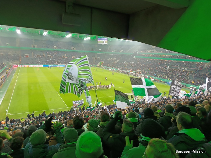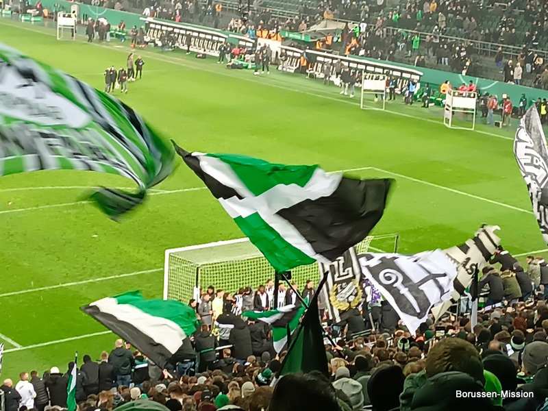 Einen Tag vor dem Nikolaustag machten sich Missionare auf dem Weg zum DFB-Pokal Achtelfinale. Sie starteten bei Schneefall, fuhren durch Eisregen und kamen im Regen am Niederrhein an. Vor genau einem Monat hatte im deutschen Fußballmuseum in Dortmund Denise Schindler, Parasportexpertin beim ZDF, für unsere Borussia ein Heimspiel und als Gegner die Loskugel mit dem VfL Wolfsburg gezogen. Nach 25 Tagen kam es wieder zu dieser Begegnung. In der Bundesliga wurden da die Niedersachsen mit 4:0 nach Hause geschickt. Nun hat der Pokal bekanntlich seine Eigenheiten und in der Geschichte des DFB-Pokals trafen beide Mannschaften bisher nur im Finale der Saison 1994/95 aufeinander. Das Spiel im Olympiastadion in Berlin zwischen dem Bundesligisten und der Mannschaft aus der Golfstadt, die zu diesem Zeitpunkt in der zweiten Bundesliga aktiv war, endete durch die Tore von Martin Dahlin, Stefan Effenberg und Heiko Herrlich 3:0 für die Fohlen. Es ist der bisher letzte große Titel der Fohlen und der Trainer war Bernd Krauss. Diese Mal traf man sich wieder im Borussiapark. Bevor die Missionare dort Platz nahmen, gingen sie ins Töff-Töff, auf den Weihnachtsmarkt, zum Endlich-Treff und ins Fanhaus. Natürlich durfte die Fanclubfahne nicht fehlen. Sie fand einen Platz zwischen dem Unter- und Oberrang ehe Schiedsrichter Bastian Dankert aus Rostock das Spiel pünktlich um 20:45 Uhr anpfiff. Leider kamen gegenüber dem Bundeligaspiel knapp 5000 Zuschauer weniger, ob es am Wetter lag oder dem Termin in der Woche, ist nicht bekannt.