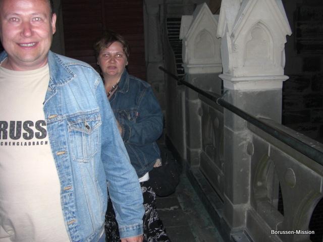 Viele schöne Fahrten zu den Spielen Borussias begannen und endeten auf dem Bahnhof der Stadt Köthen. Weit bevor man diesen erreicht, erblickt man das Wahrzeichen der Stadt Köthen, diese Kirche mit ihren Doppeltürmen. Eine Besonderheit bei der Unterstützung der Sanierung war die Möglichkeit, eine Treppenstufe vom Aufgang zur Brücke der Doppeltürme symbolisch zu erwerben und diese mit einem Namensschild zu versehen. Der Preis mit 250€ war für unseren kleinen und recht jungen Fanclub aber zu hoch. Ideen waren gefragt und so reifte der Gedanke, diesen Betrag aus dem Pfandgeld der Kästen und Flaschen zusammen zubekommen. Seit längerem wurde das Leergut, von diversen Fahrten und den gemeinsamen Treffen in der Fangarage zum gemeinsamen Verfolgen der Spiele unserer Borussia, immer mehr. Schließlich wusste keiner mehr, wem was gehörte und so fand der Vorschlag zum Erwerb der Treppenstufe durch das Pfandgeld eine breite Zustimmung. Der Anfang war also gemacht, eine Stufe wurde reserviert und so wuchs mit jedem Spiel unserer Borussia der Betrag in der Spardose stetig an. Als befreundete Borussiafanclubs von diesem Vorhaben erfuhren, gaben diese spontan auch kleine Beträge dazu. Nach der Erfüllung der Mission „Wiederaufstieg“ unserer Mannschaft und der Beginn der Saison 2008/09 hatten auch wir unser Ziel erreicht. Jetzt galt es noch, die Treppenstufe zu gestalten. Auf Anfrage bei Borussia, wurde uns mitgeteilt, dass wir zu unserem Schriftzug die Raute mit verwenden dürfen. Dies ließen wir uns nichtzweimal sagen und so wurde der Entwurf zum Ausfertigen gegeben. Heute ziert die 87.Treppenstufe dieser Entwurf und wir sind Stolz durch kleine Beträge einen großen Beitrag zur Sanierung geschafft zu haben. Der Pfarrer Lauter lud unseren Fanclub später zum Besuch des Wahrzeichens der Stadt ein und zeigte ihnen neben der evangelischen Kirche und der Stufe auch die Fürstengruft mit 40 erhaltenen Prunksärgen des Fürstentums Köthen-Anhalt. Nach dieser gelungenen Aktion suchten wir nach etwas Neuem. Wir entschieden uns für eine Tierpatenschaft für ein Fohlen im Tierpark Dessau. Ziel ist es wieder durch Flaschenpfand einen Förderverein zu unterstützen.