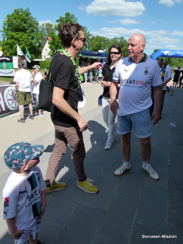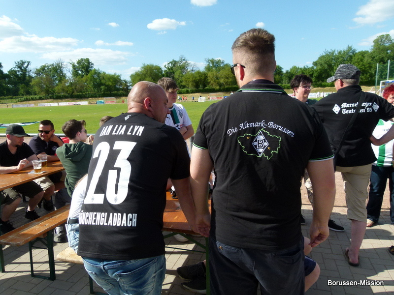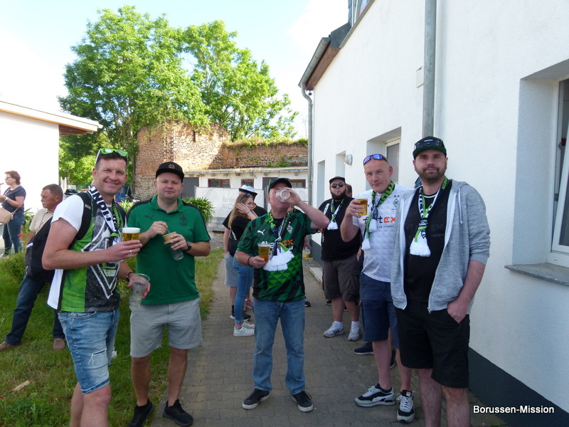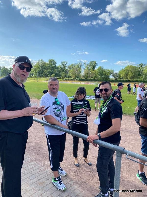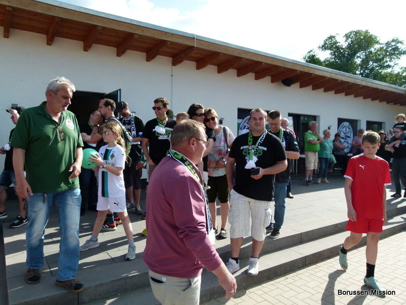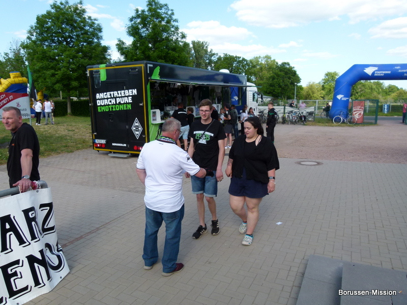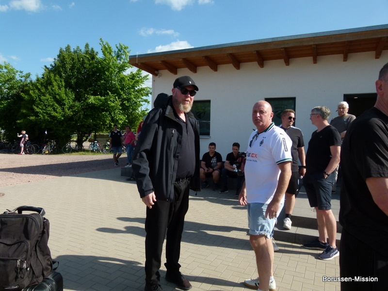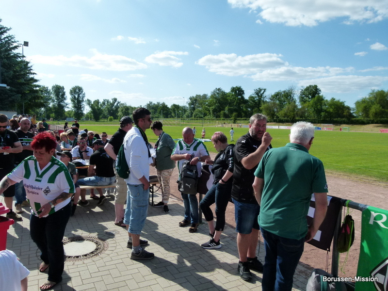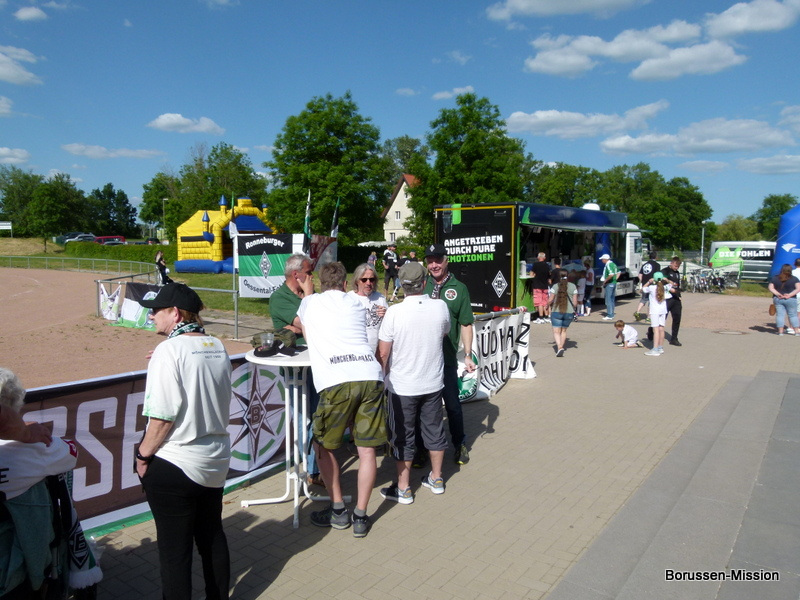 Nach dem letzten Spiel in der Fußballbundesliga begab sich die Fohlenelf auf eine dreitägige Saisonabschlusstour. Sie begannen am Pfingstmontag mit dem Freundschaftsspiel beim FC Oberneuland. Das Spiel in der Marko Mock Arena in Bremen gewannen sie mit 7:0 (2*Telelovic,2*Ngoumou, Borges Sanches, Wolf, Hofmann). Am Dienstag reisten sie am Vormittag zur Gedenkstätte Bergen-Belsen und nahmen an einer zweistündigen Führung teil, an deren Ende Kapitän Lars Stindl einen Kranz im Namen aller Borussen niederlegte. Danach ging es weiter nach Sachsen-Anhalt, in die Kleinstadt Aken an der Elbe. Hier hatte unser Fanclubpräsident, der auch Regionalbetreuer Ost des FanprojektsMG ist, zum Fanfest der Fanclubs unserer Region eingeladen. Es fand auf dem Gelände des Woodward Sportparks, der Heimspielstätte des FC Stahl Aken, statt und zum Grillen hatte sich die Profimannschaft angekündigt. Über 200 Borussen folgten der Einladung und auch Mitglieder des FC Stahl Aken. Der Fohlenshoptruck fand einen Platz, eine Hüpfburg für die Kleinsten gab es und auf dem Rasen wurden auch Stationen, wie eine Ballgeschwindigkeitsmeßstrecke, für die Größeren aufgebaut. Gemeinsam bereiteten sie den Profis einen gebührenden Empfang. Dabei waren u.a. Trainer Daniel Farke, Jan Olschowsky, Tobias Sippel, Marvin Friedrich, Ko Itakura, Nico Elvedi, Yvandro Borges Sanches, Tony Jantschke, Ibrahim Digberekou, Stefan Lainer, Joe Scally, Julian Weigl, Rocco Reitz, Luca Netz, Hannes Wolf, Lars Stindl, Jonas Hofmann, Florian Neuhaus, Oscar Fraulo, Alassane Plea, Nathan Ngoumou, Patrick Herrmann, Semir Telalovic, Oliver Neuville, Thomas „Tower“ Weimann und Christopher Heimeroth. Gemeinsam mit den Profis wurde ein Foto als Raute hinter unserer Schwenkfahne „Union Jack“ zur Erinnerung gemacht. Anschließend war genügend Zeit für gemeinsame Fotos mit den Profis, Autogramme und lockere Gespräche. Die Stadtvertreter ließen es sich nicht nehmen und so durften drei Profis als Vertreter von Borussia Mönchengladbach sich im Goldenen Buch der Stadt Aken verewigen. Lars Stindl, Jonas Hofmann und Tony Jantschke übernahmen dies. Nach etwa 90 Minuten begaben sich die Fohlen wieder in den Mannschaftsbus. Sie fuhren weiter nach Halle an der Saale ins Hotel, den am nächsten Tag war dort noch ein Freundschaftsspiel zu Gunsten des Nachwuchses beim HFC Chemie geplant. Einige Borussen der regionalen Fanclubs hatten dafür bereits Karten erworben. Unser Fanclub übergab später im Namen der Borussen-Mission dem Verein Stahl Aken als Dank für die Möglichkeit, das Fantreffen im Woodward Sportpark durchführen zu dürfen, eine Spende vor dem Fohlenshoptruck.