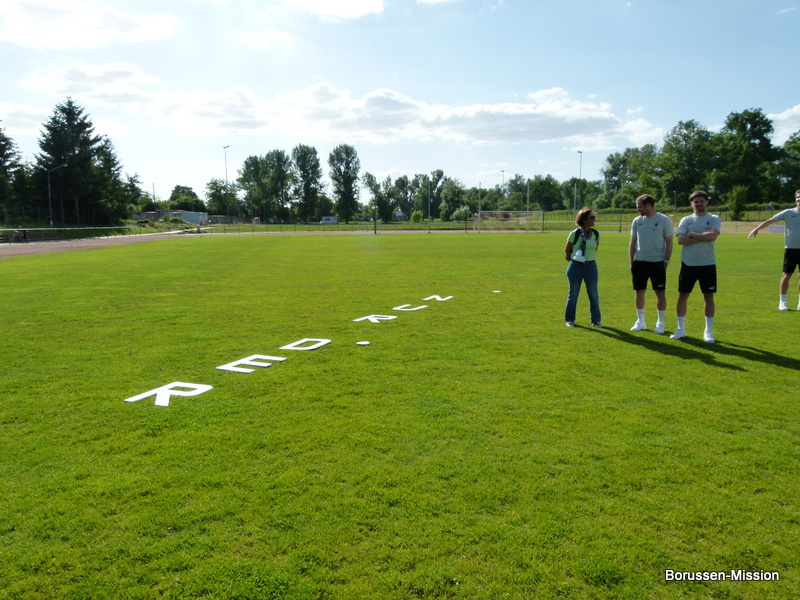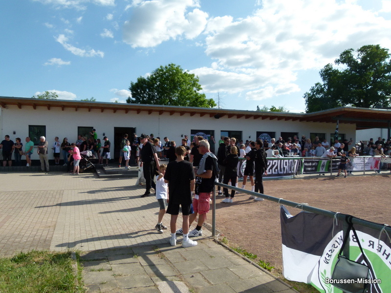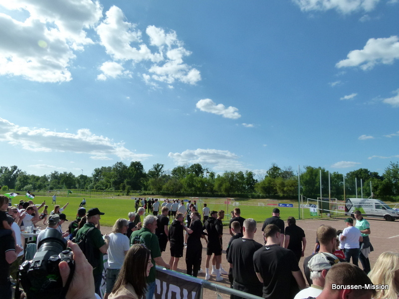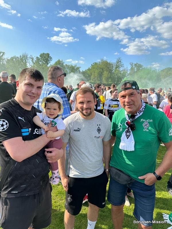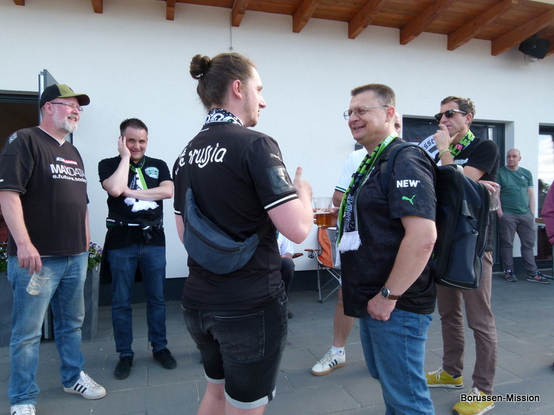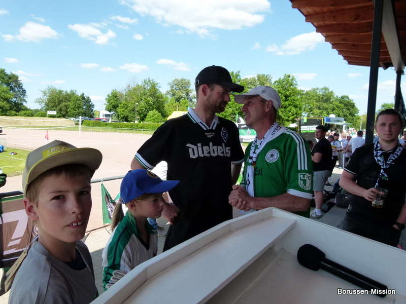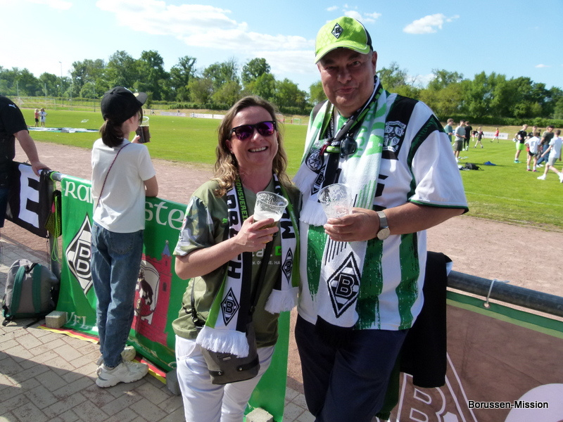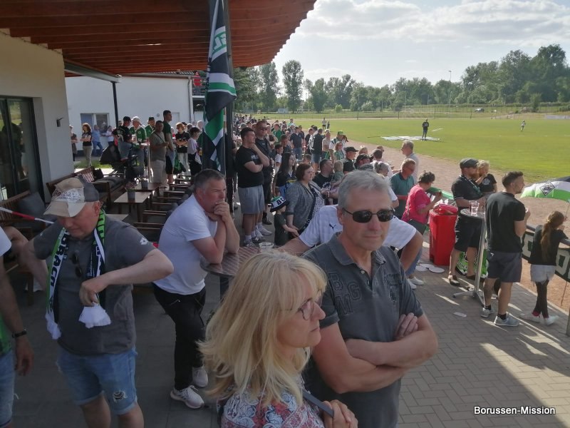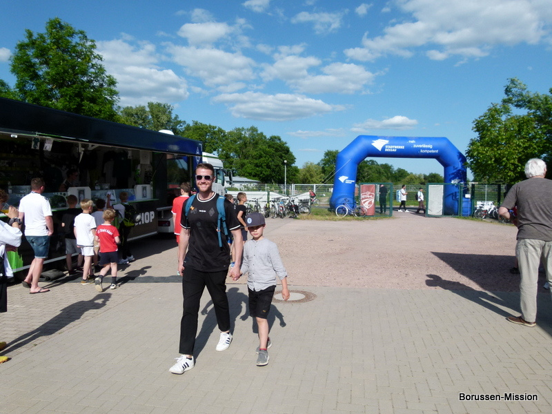 Nach dem letzten Spiel in der Fußballbundesliga begab sich die Fohlenelf auf eine dreitägige Saisonabschlusstour. Sie begannen am Pfingstmontag mit dem Freundschaftsspiel beim FC Oberneuland. Das Spiel in der Marko Mock Arena in Bremen gewannen sie mit 7:0 (2*Telelovic,2*Ngoumou, Borges Sanches, Wolf, Hofmann). Am Dienstag reisten sie am Vormittag zur Gedenkstätte Bergen-Belsen und nahmen an einer zweistündigen Führung teil, an deren Ende Kapitän Lars Stindl einen Kranz im Namen aller Borussen niederlegte. Danach ging es weiter nach Sachsen-Anhalt, in die Kleinstadt Aken an der Elbe. Hier hatte unser Fanclubpräsident, der auch Regionalbetreuer Ost des FanprojektsMG ist, zum Fanfest der Fanclubs unserer Region eingeladen. Es fand auf dem Gelände des Woodward Sportparks, der Heimspielstätte des FC Stahl Aken, statt und zum Grillen hatte sich die Profimannschaft angekündigt. Über 200 Borussen folgten der Einladung und auch Mitglieder des FC Stahl Aken. Der Fohlenshoptruck fand einen Platz, eine Hüpfburg für die Kleinsten gab es und auf dem Rasen wurden auch Stationen, wie eine Ballgeschwindigkeitsmeßstrecke, für die Größeren aufgebaut. Gemeinsam bereiteten sie den Profis einen gebührenden Empfang. Dabei waren u.a. Trainer Daniel Farke, Jan Olschowsky, Tobias Sippel, Marvin Friedrich, Ko Itakura, Nico Elvedi, Yvandro Borges Sanches, Tony Jantschke, Ibrahim Digberekou, Stefan Lainer, Joe Scally, Julian Weigl, Rocco Reitz, Luca Netz, Hannes Wolf, Lars Stindl, Jonas Hofmann, Florian Neuhaus, Oscar Fraulo, Alassane Plea, Nathan Ngoumou, Patrick Herrmann, Semir Telalovic, Oliver Neuville, Thomas „Tower“ Weimann und Christopher Heimeroth. Gemeinsam mit den Profis wurde ein Foto als Raute hinter unserer Schwenkfahne „Union Jack“ zur Erinnerung gemacht. Anschließend war genügend Zeit für gemeinsame Fotos mit den Profis, Autogramme und lockere Gespräche. Die Stadtvertreter ließen es sich nicht nehmen und so durften drei Profis als Vertreter von Borussia Mönchengladbach sich im Goldenen Buch der Stadt Aken verewigen. Lars Stindl, Jonas Hofmann und Tony Jantschke übernahmen dies. Nach etwa 90 Minuten begaben sich die Fohlen wieder in den Mannschaftsbus. Sie fuhren weiter nach Halle an der Saale ins Hotel, den am nächsten Tag war dort noch ein Freundschaftsspiel zu Gunsten des Nachwuchses beim HFC Chemie geplant. Einige Borussen der regionalen Fanclubs hatten dafür bereits Karten erworben. Unser Fanclub übergab später im Namen der Borussen-Mission dem Verein Stahl Aken als Dank für die Möglichkeit, das Fantreffen im Woodward Sportpark durchführen zu dürfen, eine Spende vor dem Fohlenshoptruck.