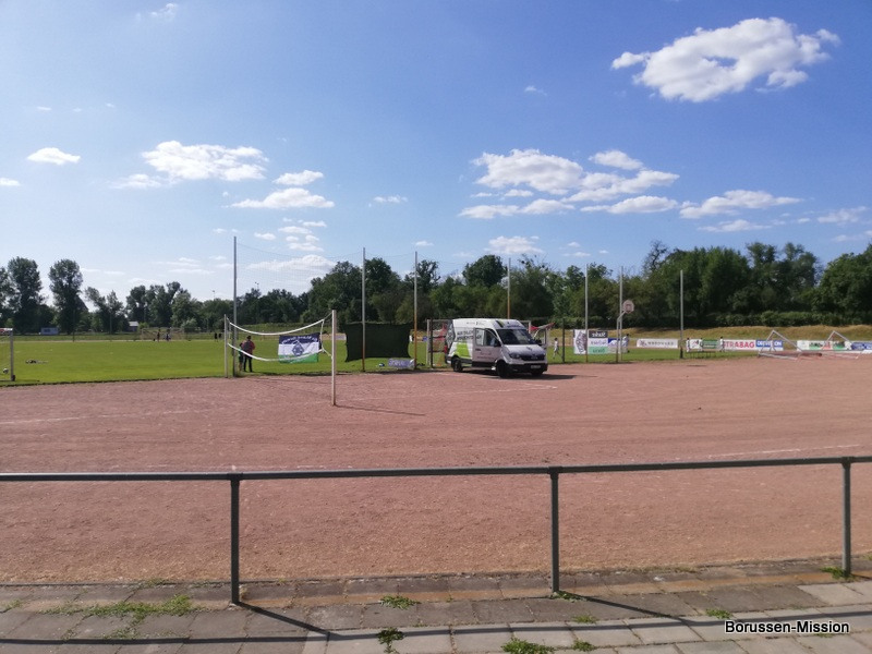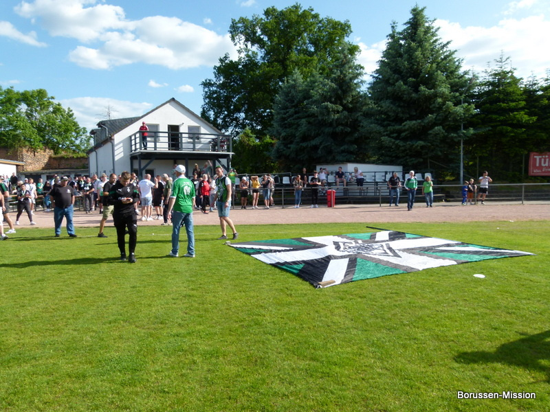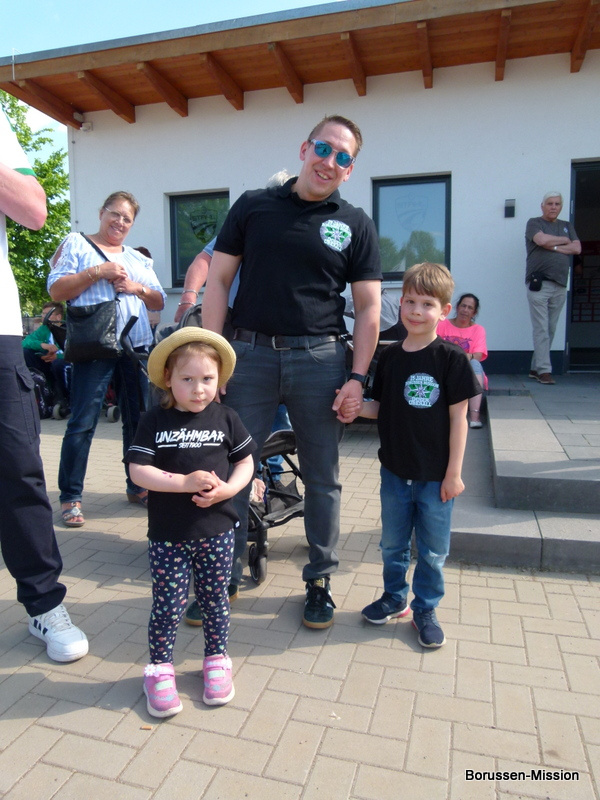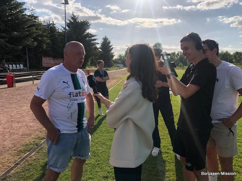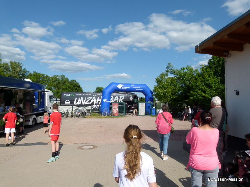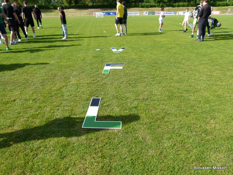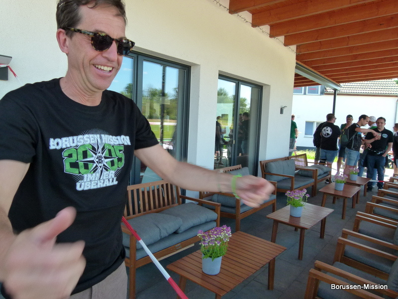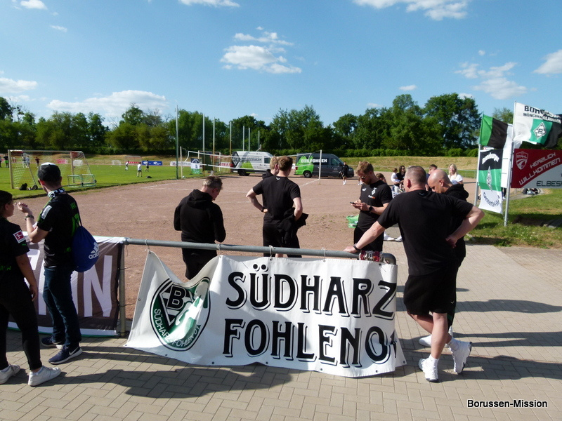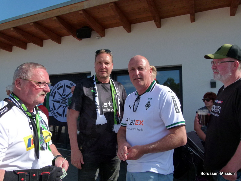 Nach dem letzten Spiel in der Fußballbundesliga begab sich die Fohlenelf auf eine dreitägige Saisonabschlusstour. Sie begannen am Pfingstmontag mit dem Freundschaftsspiel beim FC Oberneuland. Das Spiel in der Marko Mock Arena in Bremen gewannen sie mit 7:0 (2*Telelovic,2*Ngoumou, Borges Sanches, Wolf, Hofmann). Am Dienstag reisten sie am Vormittag zur Gedenkstätte Bergen-Belsen und nahmen an einer zweistündigen Führung teil, an deren Ende Kapitän Lars Stindl einen Kranz im Namen aller Borussen niederlegte. Danach ging es weiter nach Sachsen-Anhalt, in die Kleinstadt Aken an der Elbe. Hier hatte unser Fanclubpräsident, der auch Regionalbetreuer Ost des FanprojektsMG ist, zum Fanfest der Fanclubs unserer Region eingeladen. Es fand auf dem Gelände des Woodward Sportparks, der Heimspielstätte des FC Stahl Aken, statt und zum Grillen hatte sich die Profimannschaft angekündigt. Über 200 Borussen folgten der Einladung und auch Mitglieder des FC Stahl Aken. Der Fohlenshoptruck fand einen Platz, eine Hüpfburg für die Kleinsten gab es und auf dem Rasen wurden auch Stationen, wie eine Ballgeschwindigkeitsmeßstrecke, für die Größeren aufgebaut. Gemeinsam bereiteten sie den Profis einen gebührenden Empfang. Dabei waren u.a. Trainer Daniel Farke, Jan Olschowsky, Tobias Sippel, Marvin Friedrich, Ko Itakura, Nico Elvedi, Yvandro Borges Sanches, Tony Jantschke, Ibrahim Digberekou, Stefan Lainer, Joe Scally, Julian Weigl, Rocco Reitz, Luca Netz, Hannes Wolf, Lars Stindl, Jonas Hofmann, Florian Neuhaus, Oscar Fraulo, Alassane Plea, Nathan Ngoumou, Patrick Herrmann, Semir Telalovic, Oliver Neuville, Thomas „Tower“ Weimann und Christopher Heimeroth. Gemeinsam mit den Profis wurde ein Foto als Raute hinter unserer Schwenkfahne „Union Jack“ zur Erinnerung gemacht. Anschließend war genügend Zeit für gemeinsame Fotos mit den Profis, Autogramme und lockere Gespräche. Die Stadtvertreter ließen es sich nicht nehmen und so durften drei Profis als Vertreter von Borussia Mönchengladbach sich im Goldenen Buch der Stadt Aken verewigen. Lars Stindl, Jonas Hofmann und Tony Jantschke übernahmen dies. Nach etwa 90 Minuten begaben sich die Fohlen wieder in den Mannschaftsbus. Sie fuhren weiter nach Halle an der Saale ins Hotel, den am nächsten Tag war dort noch ein Freundschaftsspiel zu Gunsten des Nachwuchses beim HFC Chemie geplant. Einige Borussen der regionalen Fanclubs hatten dafür bereits Karten erworben. Unser Fanclub übergab später im Namen der Borussen-Mission dem Verein Stahl Aken als Dank für die Möglichkeit, das Fantreffen im Woodward Sportpark durchführen zu dürfen, eine Spende vor dem Fohlenshoptruck.