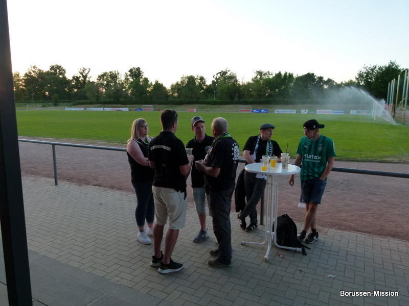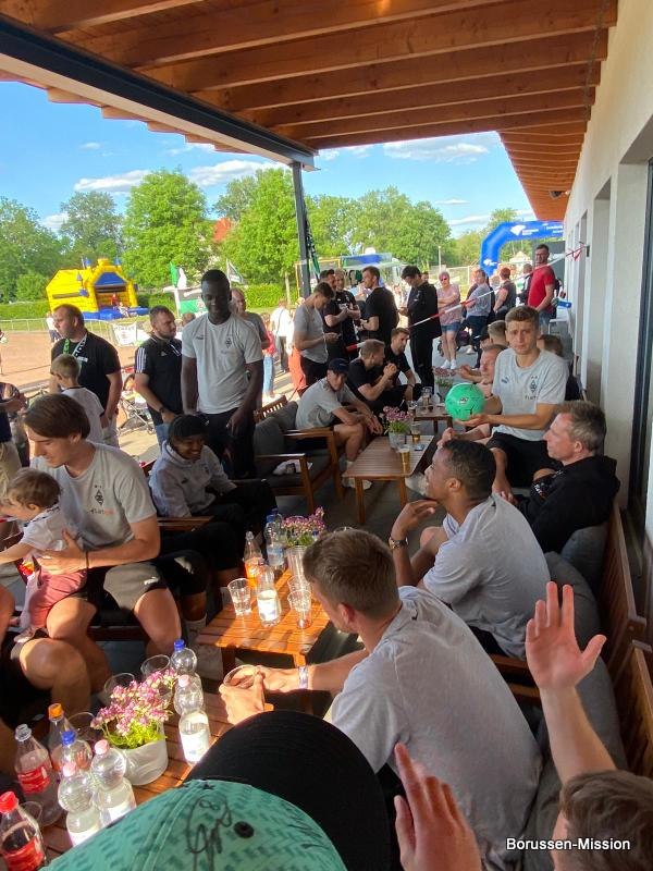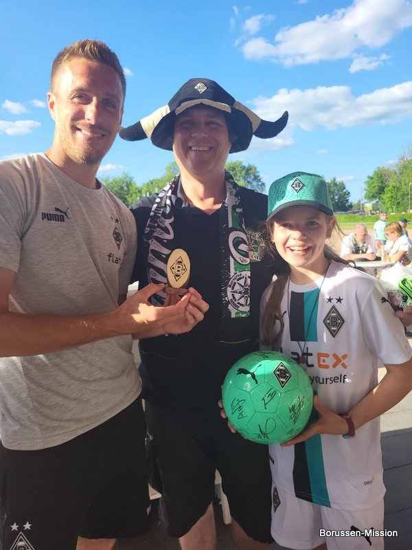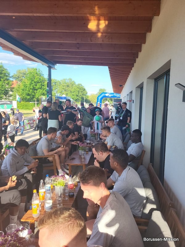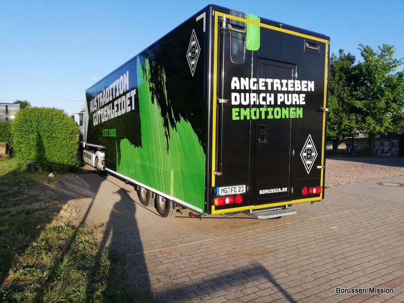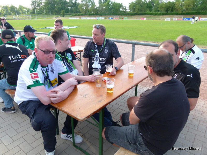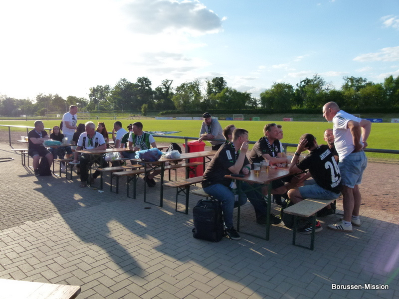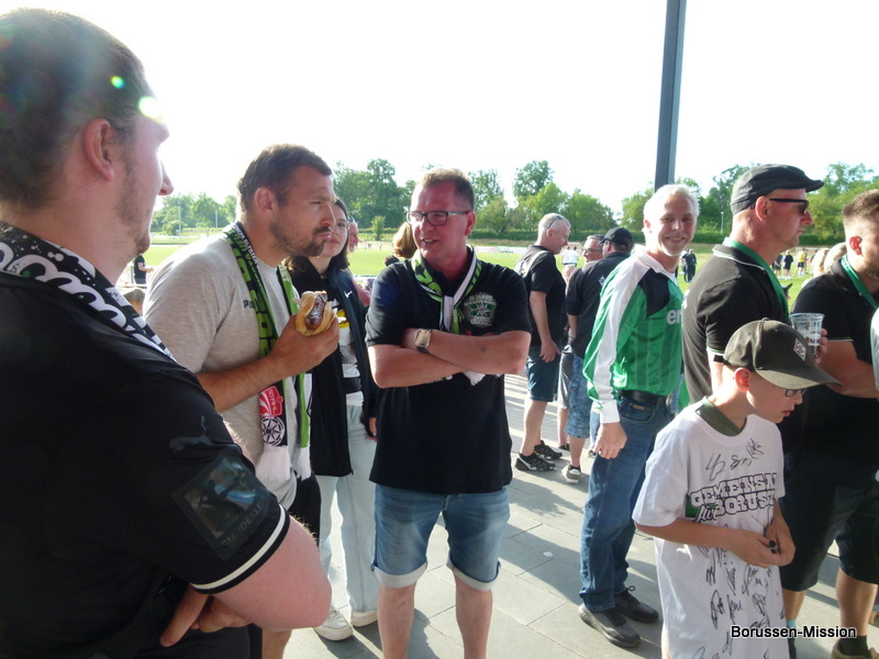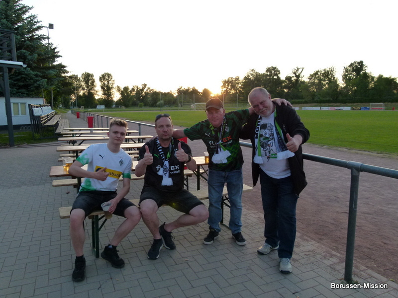 Nach dem letzten Spiel in der Fußballbundesliga begab sich die Fohlenelf auf eine dreitägige Saisonabschlusstour. Sie begannen am Pfingstmontag mit dem Freundschaftsspiel beim FC Oberneuland. Das Spiel in der Marko Mock Arena in Bremen gewannen sie mit 7:0 (2*Telelovic,2*Ngoumou, Borges Sanches, Wolf, Hofmann). Am Dienstag reisten sie am Vormittag zur Gedenkstätte Bergen-Belsen und nahmen an einer zweistündigen Führung teil, an deren Ende Kapitän Lars Stindl einen Kranz im Namen aller Borussen niederlegte. Danach ging es weiter nach Sachsen-Anhalt, in die Kleinstadt Aken an der Elbe. Hier hatte unser Fanclubpräsident, der auch Regionalbetreuer Ost des FanprojektsMG ist, zum Fanfest der Fanclubs unserer Region eingeladen. Es fand auf dem Gelände des Woodward Sportparks, der Heimspielstätte des FC Stahl Aken, statt und zum Grillen hatte sich die Profimannschaft angekündigt. Über 200 Borussen folgten der Einladung und auch Mitglieder des FC Stahl Aken. Der Fohlenshoptruck fand einen Platz, eine Hüpfburg für die Kleinsten gab es und auf dem Rasen wurden auch Stationen, wie eine Ballgeschwindigkeitsmeßstrecke, für die Größeren aufgebaut. Gemeinsam bereiteten sie den Profis einen gebührenden Empfang. Dabei waren u.a. Trainer Daniel Farke, Jan Olschowsky, Tobias Sippel, Marvin Friedrich, Ko Itakura, Nico Elvedi, Yvandro Borges Sanches, Tony Jantschke, Ibrahim Digberekou, Stefan Lainer, Joe Scally, Julian Weigl, Rocco Reitz, Luca Netz, Hannes Wolf, Lars Stindl, Jonas Hofmann, Florian Neuhaus, Oscar Fraulo, Alassane Plea, Nathan Ngoumou, Patrick Herrmann, Semir Telalovic, Oliver Neuville, Thomas „Tower“ Weimann und Christopher Heimeroth. Gemeinsam mit den Profis wurde ein Foto als Raute hinter unserer Schwenkfahne „Union Jack“ zur Erinnerung gemacht. Anschließend war genügend Zeit für gemeinsame Fotos mit den Profis, Autogramme und lockere Gespräche. Die Stadtvertreter ließen es sich nicht nehmen und so durften drei Profis als Vertreter von Borussia Mönchengladbach sich im Goldenen Buch der Stadt Aken verewigen. Lars Stindl, Jonas Hofmann und Tony Jantschke übernahmen dies. Nach etwa 90 Minuten begaben sich die Fohlen wieder in den Mannschaftsbus. Sie fuhren weiter nach Halle an der Saale ins Hotel, den am nächsten Tag war dort noch ein Freundschaftsspiel zu Gunsten des Nachwuchses beim HFC Chemie geplant. Einige Borussen der regionalen Fanclubs hatten dafür bereits Karten erworben. Unser Fanclub übergab später im Namen der Borussen-Mission dem Verein Stahl Aken als Dank für die Möglichkeit, das Fantreffen im Woodward Sportpark durchführen zu dürfen, eine Spende vor dem Fohlenshoptruck.