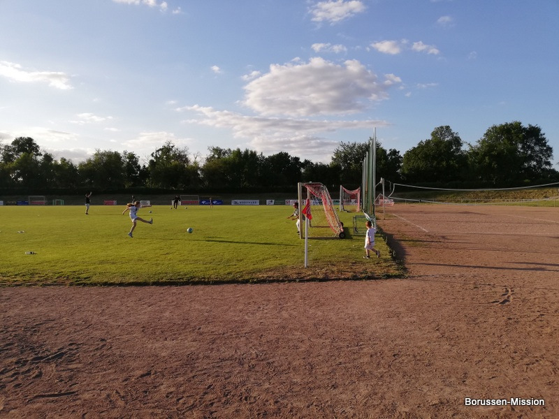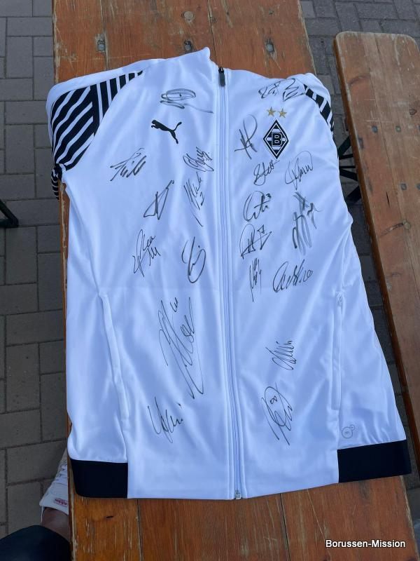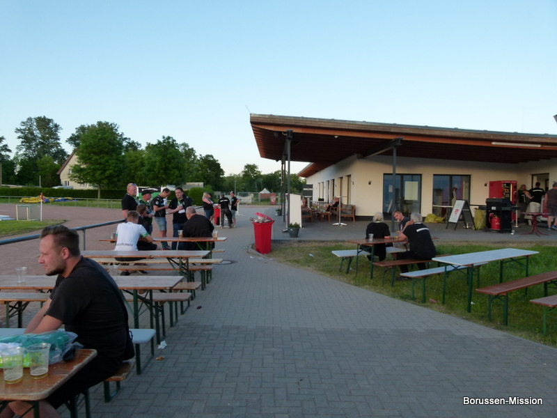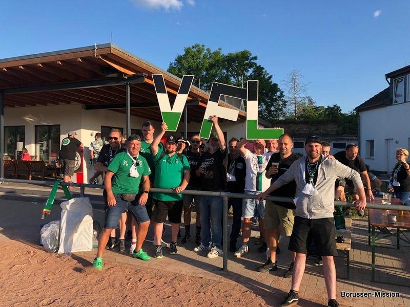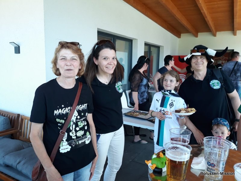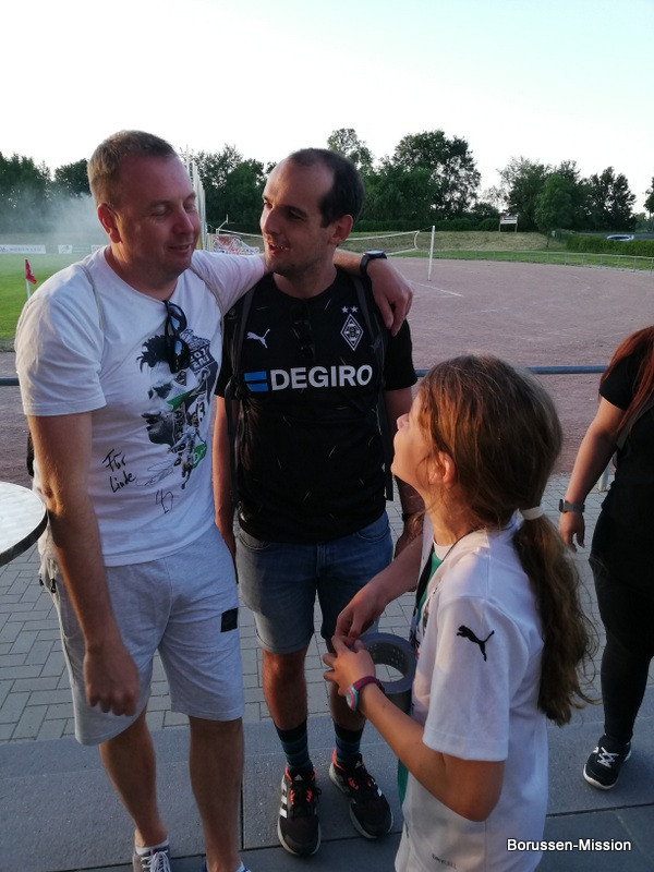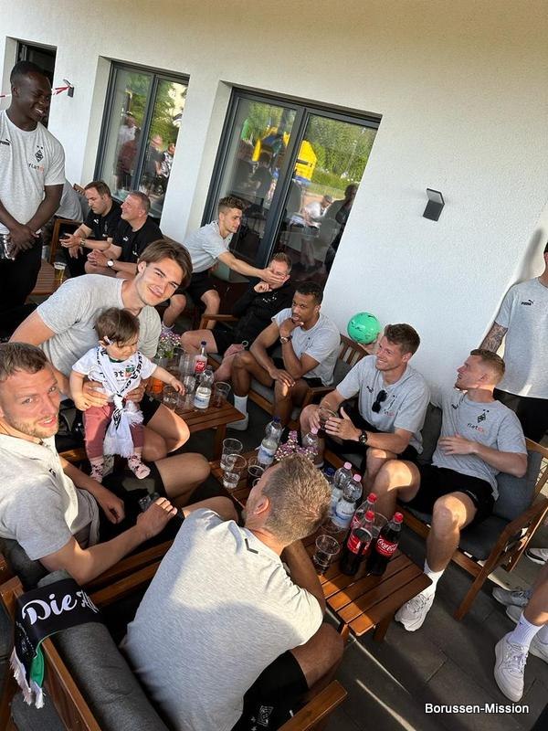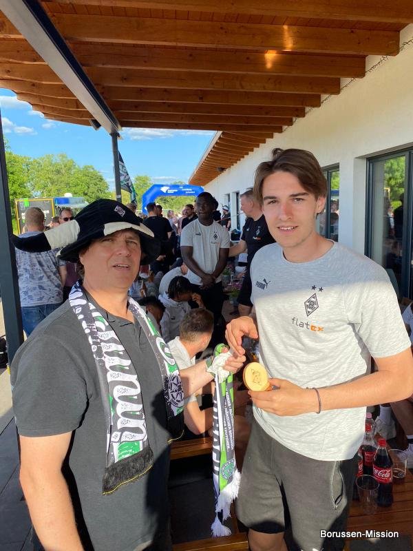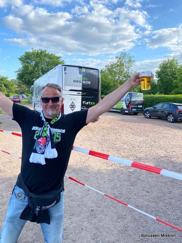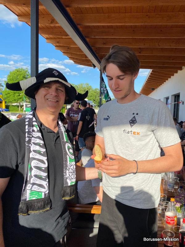Nach dem letzten Spiel in der Fußballbundesliga begab sich die Fohlenelf auf eine dreitägige Saisonabschlusstour. Sie begannen am Pfingstmontag mit dem Freundschaftsspiel beim FC Oberneuland. Das Spiel in der Marko Mock Arena in Bremen gewannen sie mit 7:0 (2*Telelovic,2*Ngoumou, Borges Sanches, Wolf, Hofmann). Am Dienstag reisten sie am Vormittag zur Gedenkstätte Bergen-Belsen und nahmen an einer zweistündigen Führung teil, an deren Ende Kapitän Lars Stindl einen Kranz im Namen aller Borussen niederlegte. Danach ging es weiter nach Sachsen-Anhalt, in die Kleinstadt Aken an der Elbe. Hier hatte unser Fanclubpräsident, der auch Regionalbetreuer Ost des FanprojektsMG ist, zum Fanfest der Fanclubs unserer Region eingeladen. Es fand auf dem Gelände des Woodward Sportparks, der Heimspielstätte des FC Stahl Aken, statt und zum Grillen hatte sich die Profimannschaft angekündigt. Über 200 Borussen folgten der Einladung und auch Mitglieder des FC Stahl Aken. Der Fohlenshoptruck fand einen Platz, eine Hüpfburg für die Kleinsten gab es und auf dem Rasen wurden auch Stationen, wie eine Ballgeschwindigkeitsmeßstrecke, für die Größeren aufgebaut. Gemeinsam bereiteten sie den Profis einen gebührenden Empfang. Dabei waren u.a. Trainer Daniel Farke, Jan Olschowsky, Tobias Sippel, Marvin Friedrich, Ko Itakura, Nico Elvedi, Yvandro Borges Sanches, Tony Jantschke, Ibrahim Digberekou, Stefan Lainer, Joe Scally, Julian Weigl, Rocco Reitz, Luca Netz, Hannes Wolf, Lars Stindl, Jonas Hofmann, Florian Neuhaus, Oscar Fraulo, Alassane Plea, Nathan Ngoumou, Patrick Herrmann, Semir Telalovic, Oliver Neuville, Thomas „Tower“ Weimann und Christopher Heimeroth. Gemeinsam mit den Profis wurde ein Foto als Raute hinter unserer Schwenkfahne „Union Jack“ zur Erinnerung gemacht. Anschließend war genügend Zeit für gemeinsame Fotos mit den Profis, Autogramme und lockere Gespräche. Die Stadtvertreter ließen es sich nicht nehmen und so durften drei Profis als Vertreter von Borussia Mönchengladbach sich im Goldenen Buch der Stadt Aken verewigen. Lars Stindl, Jonas Hofmann und Tony Jantschke übernahmen dies. Nach etwa 90 Minuten begaben sich die Fohlen wieder in den Mannschaftsbus. Sie fuhren weiter nach Halle an der Saale ins Hotel, den am nächsten Tag war dort noch ein Freundschaftsspiel zu Gunsten des Nachwuchses beim HFC Chemie geplant. Einige Borussen der regionalen Fanclubs hatten dafür bereits Karten erworben. Unser Fanclub übergab später im Namen der Borussen-Mission dem Verein Stahl Aken als Dank für die Möglichkeit, das Fantreffen im Woodward Sportpark durchführen zu dürfen, eine Spende vor dem Fohlenshoptruck.