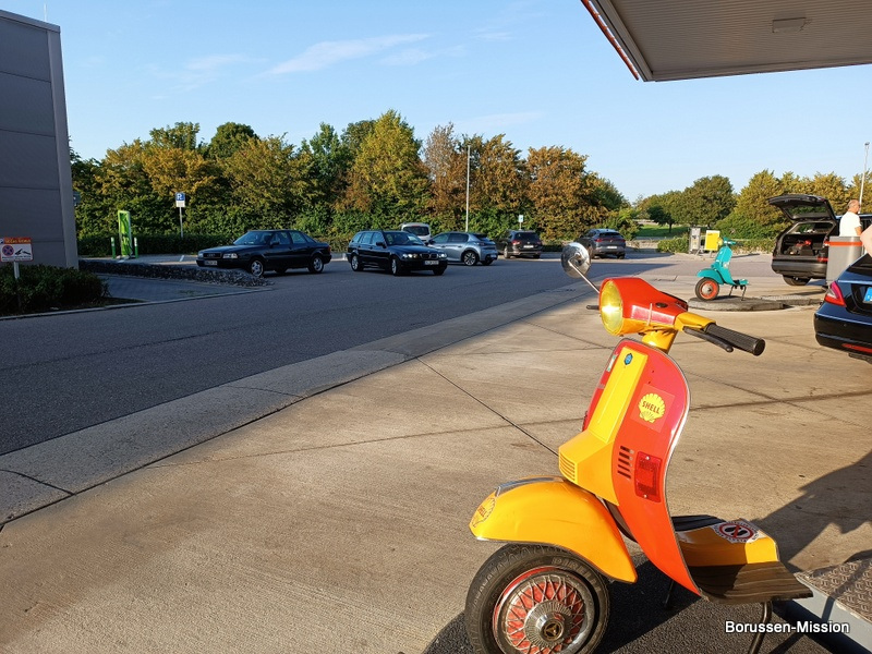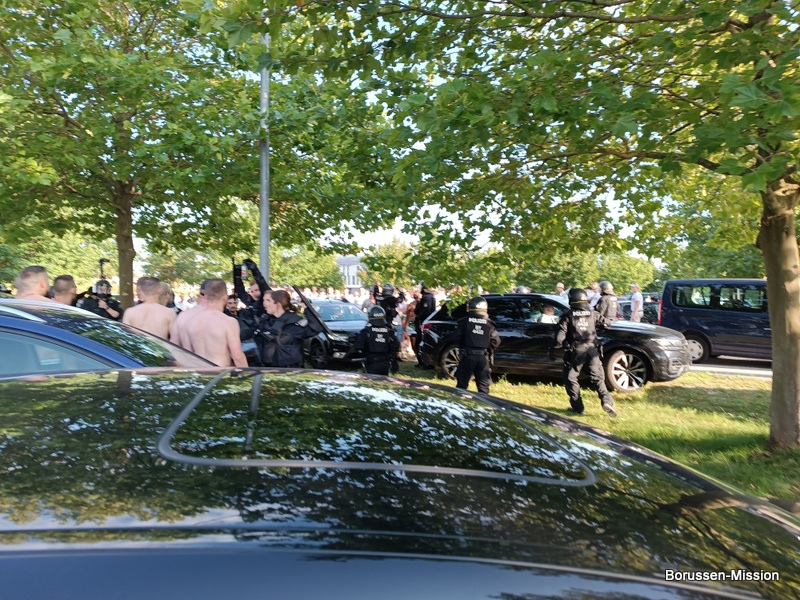 Bei herrlichem Sonnenschein war es ein abwechslungsreiches Spiel. Viele Borussen glaubten bei den 2 Tore Führungen an einen Auswärtssieg. Leider wurde Schiedsrichter Schlager in der letzten Nachspielminute der ersten Halbzeit vom VAR kontaktiert. Die leichte Berührung von Luca wurde nach langer Videokontrolle als Foul nachgewertet und Elfmeter für die Hausherren gegeben. Diesen verwandelte Michel und es ging Unentschieden in die Halbzeitpause. In der letzten Minute der siebenminütigen Nachspielzeit gab es erneut einen Pfiff und diesmal wurde direkt auf dem Punkt gezeigt. Die Situation wurde auch durch den VAR überprüft und diesmal nicht als Fehlentscheidung gewertet. Den Elfmeter verwandelte Borussias tschechischer Neuzugang von Sparta Prag und dadurch konnten die Fohlen wenigstens einen Punkt mitnehmen. Dieser wurde nach dem Spiel mit der Mannschaft gefeiert, ehe man warten musste, dass man vom Parkplatz kam. Kurios war noch, dass die sportlichen Fraktionen, getrennt von der Polizei, über den Parkplatz geführt wurden, zum Glück passierte dabei nichts. Auf der Heimfahrt wurde ein Stopp an einer Tankstelle gemacht und der letzte Mitfahrer erreichte vor Mitternacht sein zu Hause.