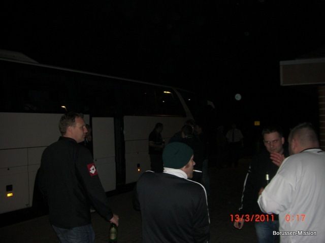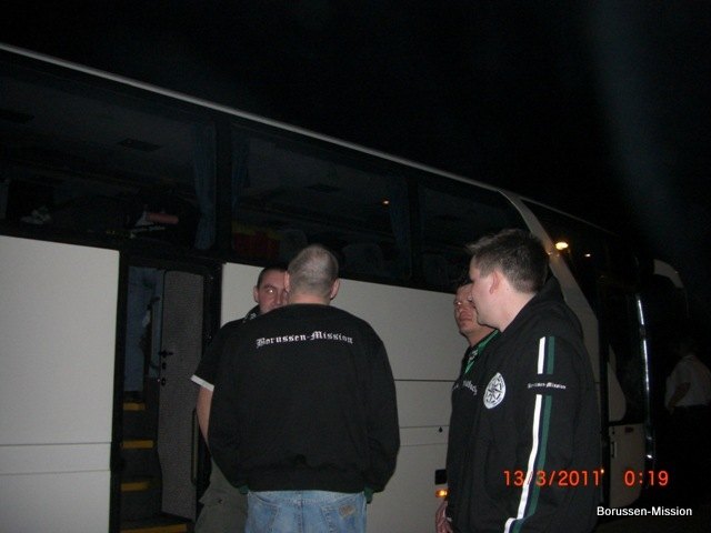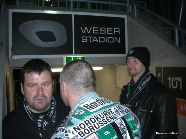 Das späte Spiel am Samstag wollten sich über 15 Missionare, 5 Kyffhäuser­fohlen und mehrere Borussenfreunde nicht entgehen lassen und machten sich gemeinsam mit dem Bus auf den Weg in die Freie Hansestadt Bremen. Diese besteht aus den Stadtgemeinden Bremerhaven und Bremen, die 60 Kilometer voneinander entfernt sind. Die Stadtgemeinde Bremen liegt auf einer Weserdüne etwa 10 Meter über dem Meeresspiegel und wurde im Jahre 787 durch Karl den Großen zum Bischofsitz erklärt. Der wahrscheinlich älteste Siedlungsteil der Stadt ist Schnoor, das mittelalterliche Gängeviertel. Hier wurden früher Seile und Taue (Schnoor = Schnur) hergestellt. Die Fahrt ging aber zum Fussballstadion der Stadt, welches sich auf dem Peterswerder befindet. Es war am 06.Mai 1980 Ausgangspunkt für Straßenschlachten. Grund war das feierliche Gelöbnis von 1200 Rekruten der Bundeswehr anlässlich des 25-jährigen Jubiläums des NATO-Beitritts. Etwa 10 000 Gegendemonstranten störten die Feierlichkeiten im Weserstadion und die Situation eskalierte. Heute erstrahlt das Stadion nach dem Umbau im neuen Glanze, wobei die Kapazität ursprünglich auf 50 000 Zuschauer gesteigert werden sollte. Die Flutlichtmasten hätten für einen dritten Oberrang weichen müssen, was aber durch gestiegene Stahlpreise und einer daraus folgenden Kostensteigerung verworfen wurde. Als Besonderheit kann man die Solaranlage bezeichnen, die sich nicht nur auf dem Dach befindet. Auf etwa 10 000 m² ziehen sich Photovoltaikzellen wie eine Hülle von Osten über Süden nach Westen um das Stadion. Diese Anlage soll laut Betreiber bis zu 840 000 Kilowattstunden Strom im Jahr erzeugen und lässt durch ihre Bauweise noch genügend Licht ins Stadion. Für einige Mitreisende mussten noch Eintrittskarten besorgt werden und so ging es nach Ankunft direkt zum Stadion. Auf dem Weg zum Gästeeingang kam man an vielen Imbissbuden vorbei, wobei viele Fischbrötchen im Angebot hatten. Man traf befreundete Borussen der Ränzelstecher und ForeverYoung98 und gemeinsam begab man sich ins Stadion. Vor Spielbeginn wurde mit einer Gedenkminute an die Opfer des schweren Erdbebens und nachfolgenden Tsunamis in Japan vom Vortag gedacht.