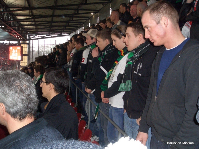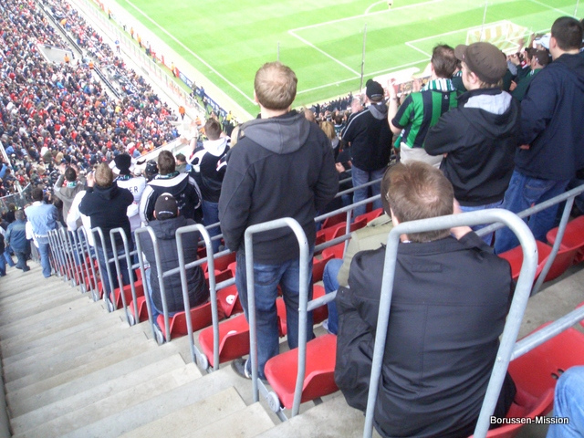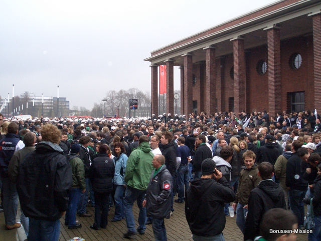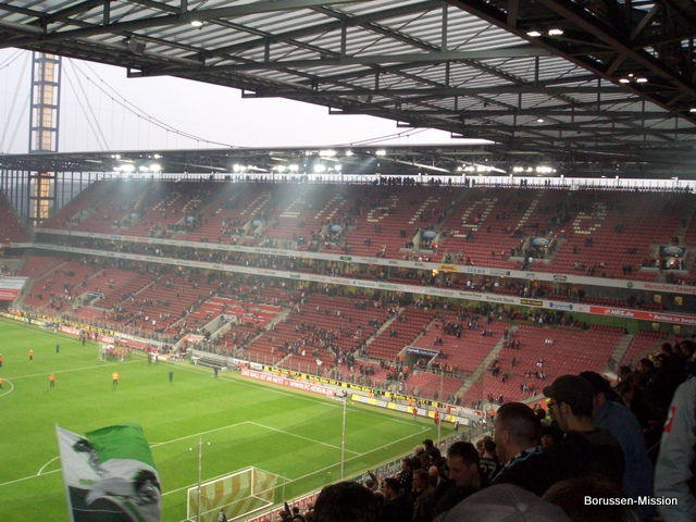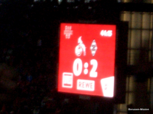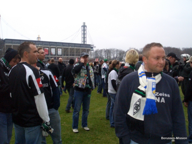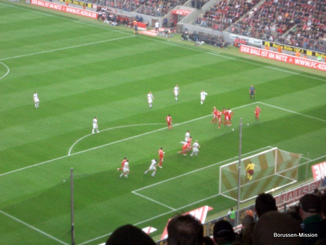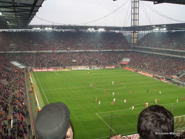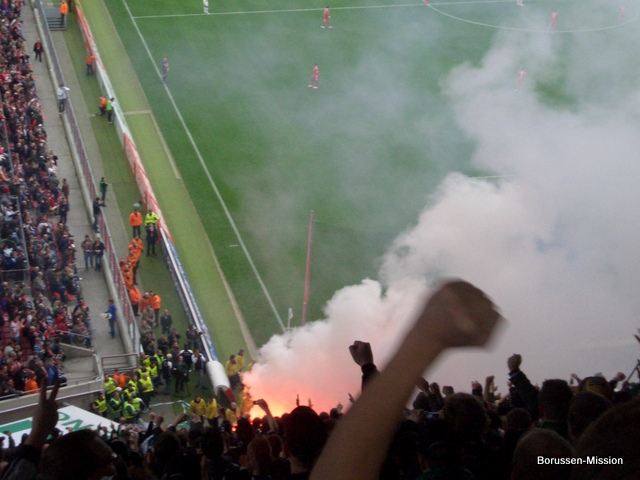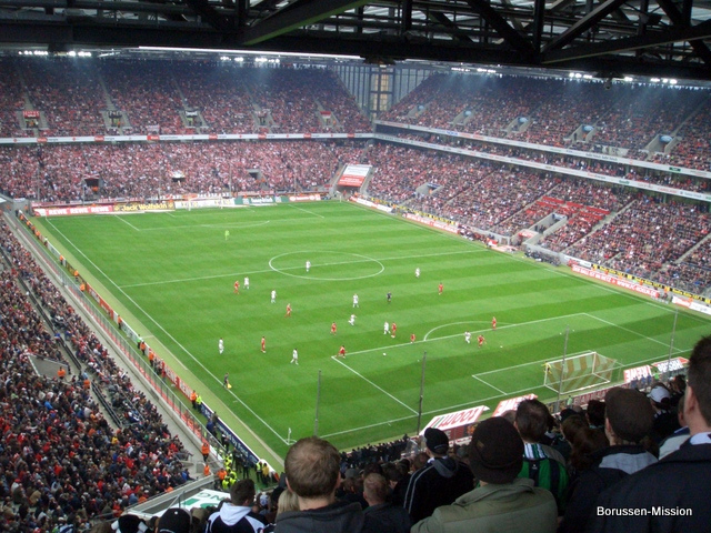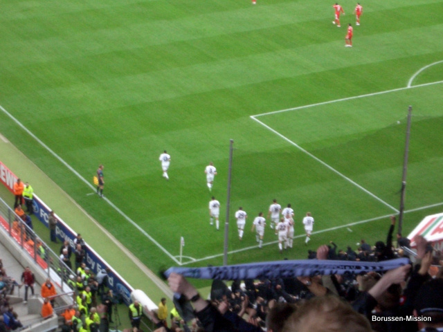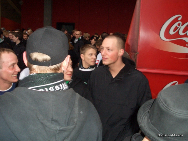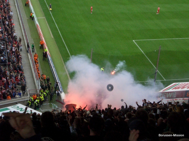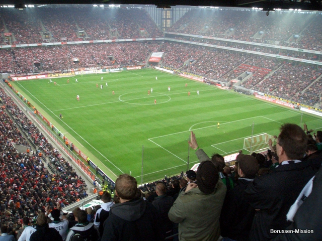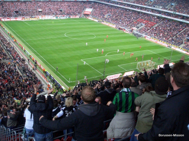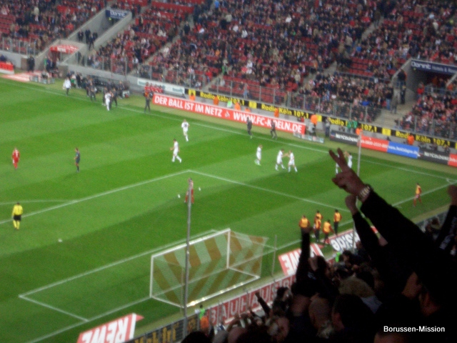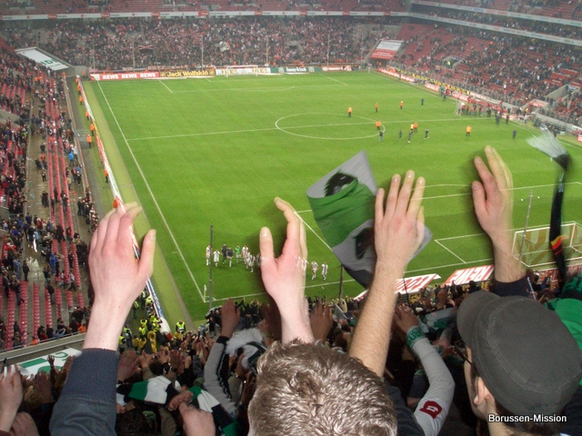 Der Bus in die verbotene Stadt startete früh am Morgen und bereits gegen Mittag waren wir da. Nachdem die Busfahrer einen Parkplatz in Stadionnähe fanden, wurde erst noch etwas getrunken und dabei zugesehen, dass auf dem Parkplatz immer mehr Heimfans ihr Fortbewegungsmittel parkten. Mit einer so zeitigen Ankunft hatten selbst die freundlichen Helfer nicht gerechnet, die irgendwann sich zu uns gesellten. An diesem Tag wollten die Ultras vom Bahnhof zum Stadion einen Bannermarsch machen. Bevor es der Andrang am Gästeeingang dann zu groß werden sollte, begaben sich die Borussen zum Stadion. Kurz bevor sie am Drehkreuz waren, hörten sie einen gröllenden kleinen Mob von Jugendlichen. Da keine Polizei in der Nähe war, dachten viele, dass es Borussen wären. Ohne Ankündigung warfen sie plötzlich mit Steinen, Flaschen und Pyrotechnik auf normale Anhänger der Fohlen, wie erbärmlich. Die Situation hatten die Einsatzkräfte bald unter Kontrolle und so ging es mit erhöhtem Adrenalinspiegel ins Stadion. Es dauerte nicht lange, da kamen die fast 2000 Gladbacher mit ihrem Marsch am Stadion an, von dem kleinen Mob war weit und breit nichts zu sehen. Die Fohlen warteten ab und überließen das Spiel den Hausherren. Nach einem Fehlpass schnappte sich Marko Marin das Spielgerät, lief in den Strafraum und passte auf Michael Bradley, der zur Führung traf. Die Hausherren kamen am Abwehrbollwerk der Fohlen nicht vorbei. Kurz vor der Halbzeit passte Baumjohann in den Lauf von Karim Matmour. Dieser umspielte Mondragon im Tor der Gastgeber und erhöhte die Führung. FC-Trainer Daum brachte zu Beginn der zweiten Halbzeit frische Offensivkräfte. Da sich die Fohlen zurückzogen, erspielten sich die Hausherren mehrere Chancen. Als Brecko aufs Tor schoss, fälschte den Schuss Bradley unglücklich ab. Das Spielgerät traf den Pfosten und sprang dann über die Torlinie. Die Fohlen ließen sich davon nicht beeindrucken und stellten den Abstand durch den Treffer von Rob Friend kurze Zeit später wieder her. Nun versuchten die Fohlen den vierten Treffer zu erzielen. Es trafen die Hausherren durch Brecko. Aber auch diesmal spielten die Fohlen munter weiter. Als Gal Albermann durch Pezzoni im Strafraum zu Fall kam, pfiff Schiedsrichter Kinnhöfer und zeigte auf den Punkt. Den Strafstoß verwandelte Michael Bradley kurz vor dem Spielende und damit stand der Derbysieger fest.