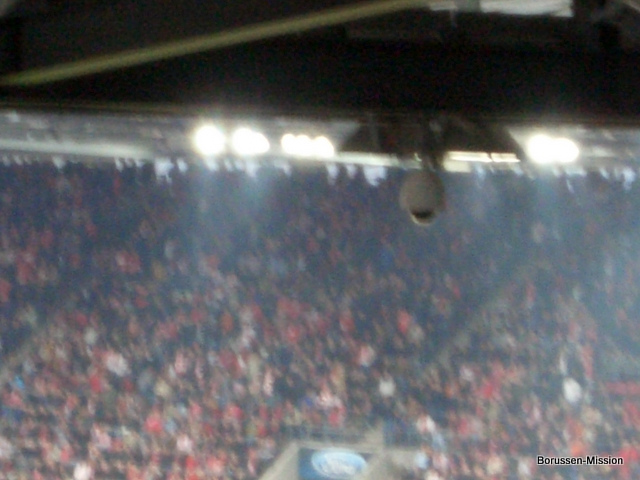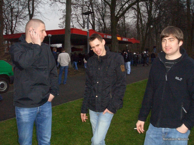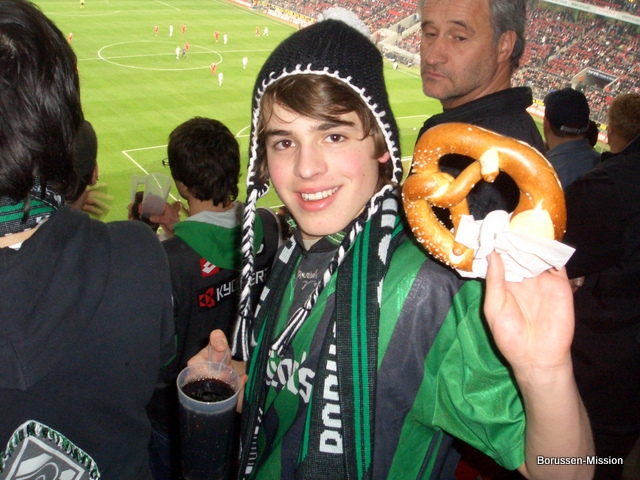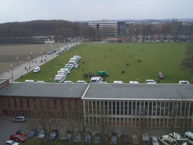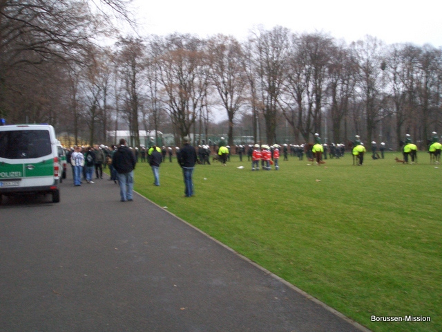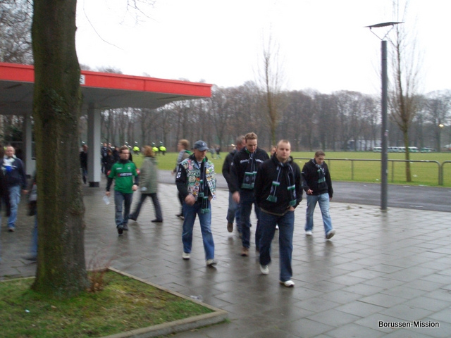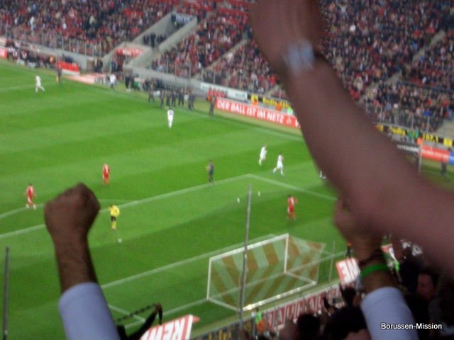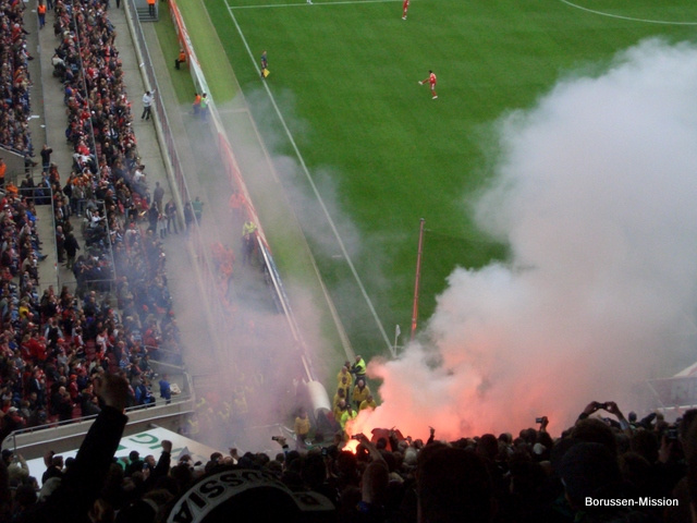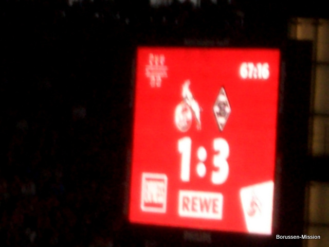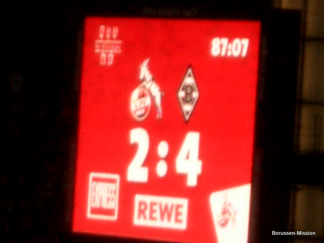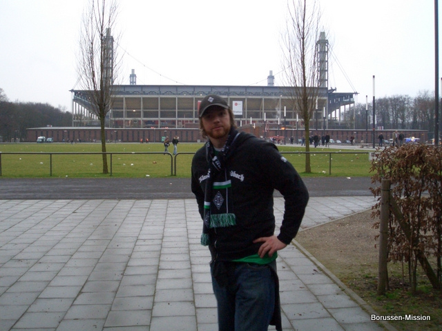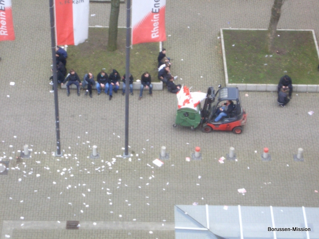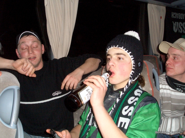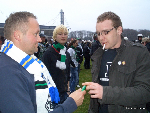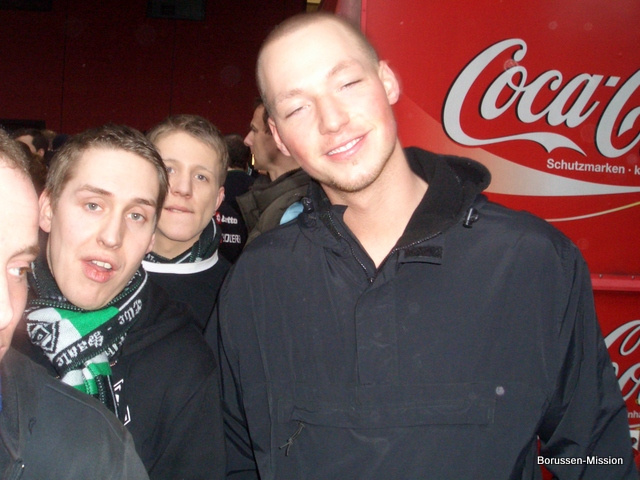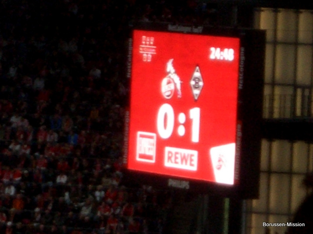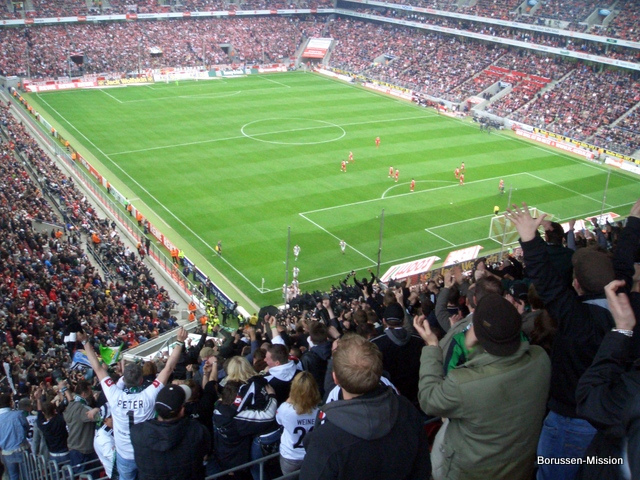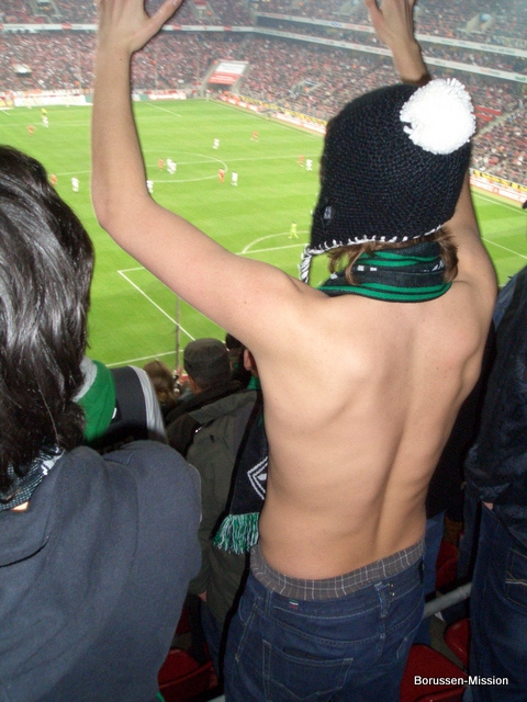 Der Bus in die verbotene Stadt startete früh am Morgen und bereits gegen Mittag waren wir da. Nachdem die Busfahrer einen Parkplatz in Stadionnähe fanden, wurde erst noch etwas getrunken und dabei zugesehen, dass auf dem Parkplatz immer mehr Heimfans ihr Fortbewegungsmittel parkten. Mit einer so zeitigen Ankunft hatten selbst die freundlichen Helfer nicht gerechnet, die irgendwann sich zu uns gesellten. An diesem Tag wollten die Ultras vom Bahnhof zum Stadion einen Bannermarsch machen. Bevor es der Andrang am Gästeeingang dann zu groß werden sollte, begaben sich die Borussen zum Stadion. Kurz bevor sie am Drehkreuz waren, hörten sie einen gröllenden kleinen Mob von Jugendlichen. Da keine Polizei in der Nähe war, dachten viele, dass es Borussen wären. Ohne Ankündigung warfen sie plötzlich mit Steinen, Flaschen und Pyrotechnik auf normale Anhänger der Fohlen, wie erbärmlich. Die Situation hatten die Einsatzkräfte bald unter Kontrolle und so ging es mit erhöhtem Adrenalinspiegel ins Stadion. Es dauerte nicht lange, da kamen die fast 2000 Gladbacher mit ihrem Marsch am Stadion an, von dem kleinen Mob war weit und breit nichts zu sehen. Die Fohlen warteten ab und überließen das Spiel den Hausherren. Nach einem Fehlpass schnappte sich Marko Marin das Spielgerät, lief in den Strafraum und passte auf Michael Bradley, der zur Führung traf. Die Hausherren kamen am Abwehrbollwerk der Fohlen nicht vorbei. Kurz vor der Halbzeit passte Baumjohann in den Lauf von Karim Matmour. Dieser umspielte Mondragon im Tor der Gastgeber und erhöhte die Führung. FC-Trainer Daum brachte zu Beginn der zweiten Halbzeit frische Offensivkräfte. Da sich die Fohlen zurückzogen, erspielten sich die Hausherren mehrere Chancen. Als Brecko aufs Tor schoss, fälschte den Schuss Bradley unglücklich ab. Das Spielgerät traf den Pfosten und sprang dann über die Torlinie. Die Fohlen ließen sich davon nicht beeindrucken und stellten den Abstand durch den Treffer von Rob Friend kurze Zeit später wieder her. Nun versuchten die Fohlen den vierten Treffer zu erzielen. Es trafen die Hausherren durch Brecko. Aber auch diesmal spielten die Fohlen munter weiter. Als Gal Albermann durch Pezzoni im Strafraum zu Fall kam, pfiff Schiedsrichter Kinnhöfer und zeigte auf den Punkt. Den Strafstoß verwandelte Michael Bradley kurz vor dem Spielende und damit stand der Derbysieger fest.