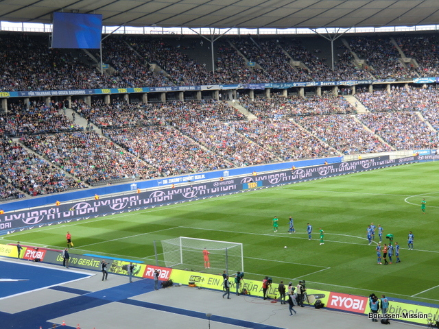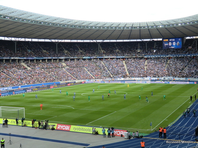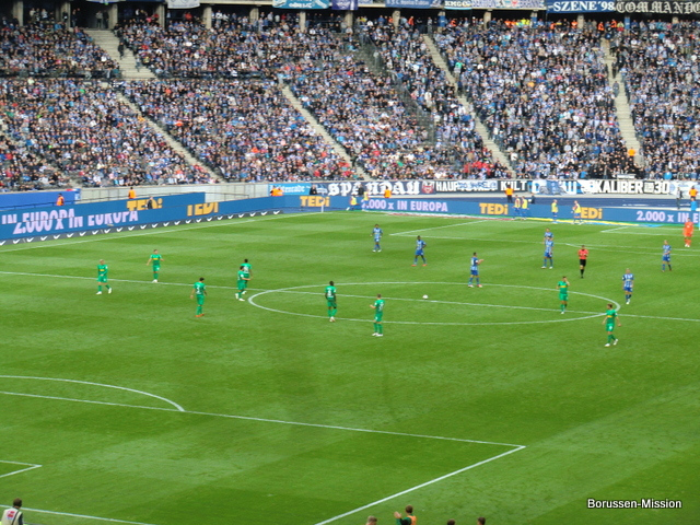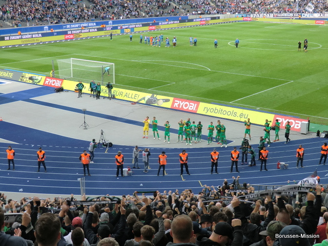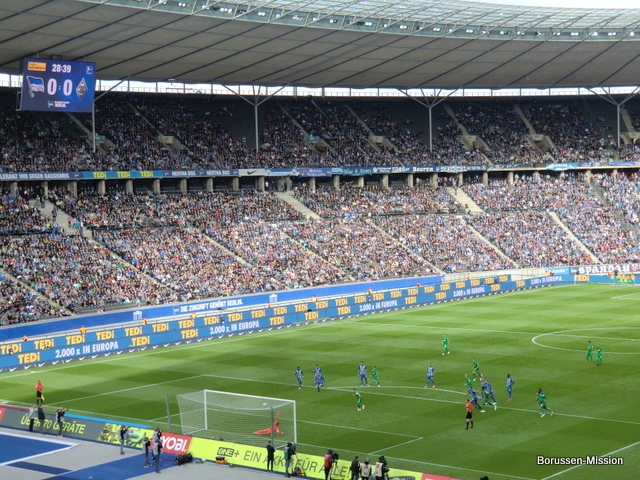 Zum Spiel: Trainer Dieter Hecking schickte dieselbe Elf auf den Rasen, die gegen Schalke gewann. So stand Yann Sommer im Tor, Oscar Wendt, Matthias Ginter, Tony Jantschke und Nico Elvedi bildeten die Abwehr, davor standen Tobias Strobl, Jonas Hofmann und Denis Zakaria und im Angriff Fabian Johnson, Alassane Plea und Thorgan Hazard. Gleich zu Beginn hatte Thorgan Hazard die Chance auf den Führungstreffer. Sein Schuss ging knapp am Tor von Jarstein vorbei. Wenig später kam der Berliner Duda freistehend zum Kopfball, traf das Spielgerät zum Glück nicht richtig. Die Berliner kamen immer wieder zu einfachen Abschlüssen. So musste Yann Sommer gegen Ibisevic retten, der gern bisher gegen unsere Fohlen ins Tor traf. Während eines Laufduells zwischen Fabian Johnson und dem Berliner Stark ertönt ein Pfiff von Schiedsrichter Markus Schmidt. Den Strafstoß verwandelte Thorgan Hazard sicher und der gut gefüllte Gästebereich tanzte. Während die Borussen sich noch in den Armen lagen, flankte der unbedrängte Plattenhardt auf den freistehenden Ibisevic, der nun das Spielgerät besser traf und den Ausgleich erzielte. Keine fünf Minuten später fiel nach ähnlichem Muster der Führungstreffer für die Hauptstädter. Dilrosun kann flanken und Lazaro unbedrängt zur Führung ins Netz köpfen. Die mitgereisten Borussen konnten es nicht glauben, wie einfach die Fohlenelf die Führung verschenkte. Grunjic hatte dann noch eine Doppelchance, die er vor der Halbzeit zum Glück nicht nutzte.