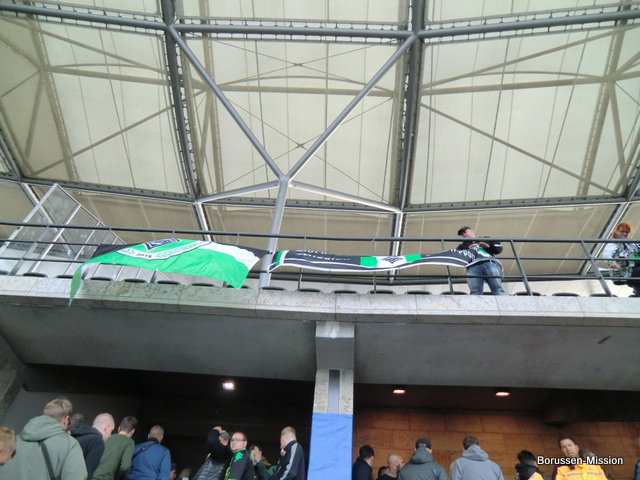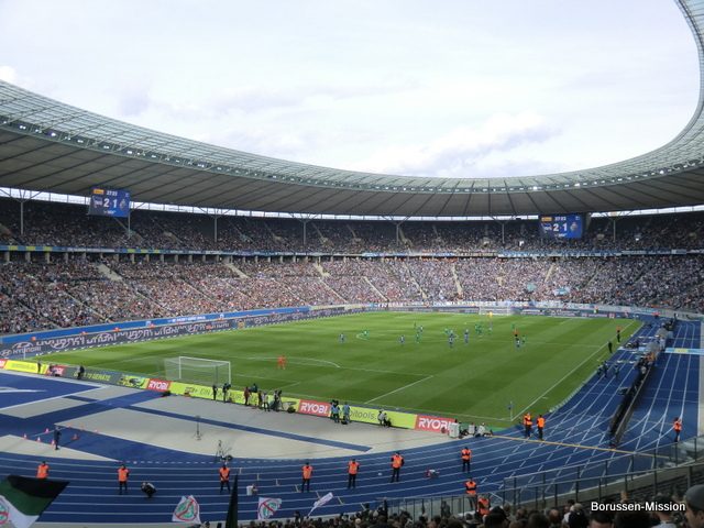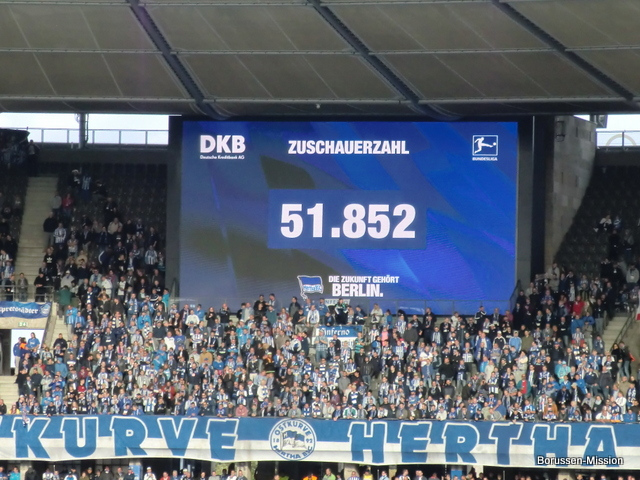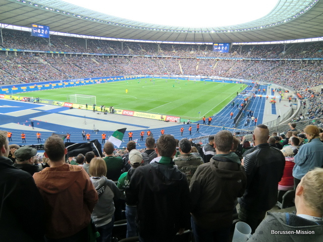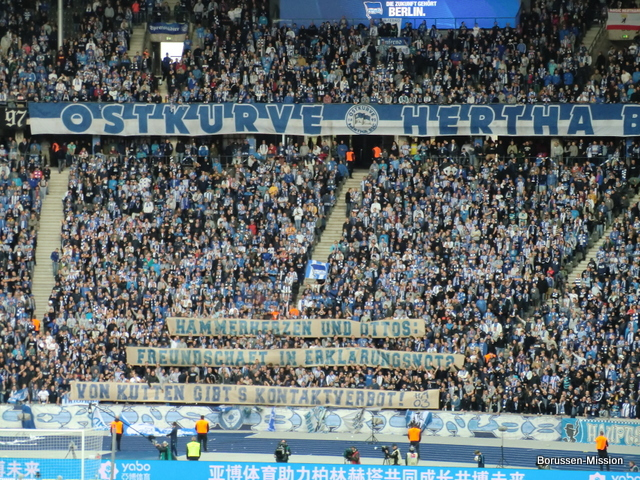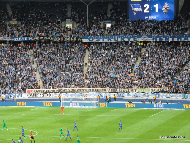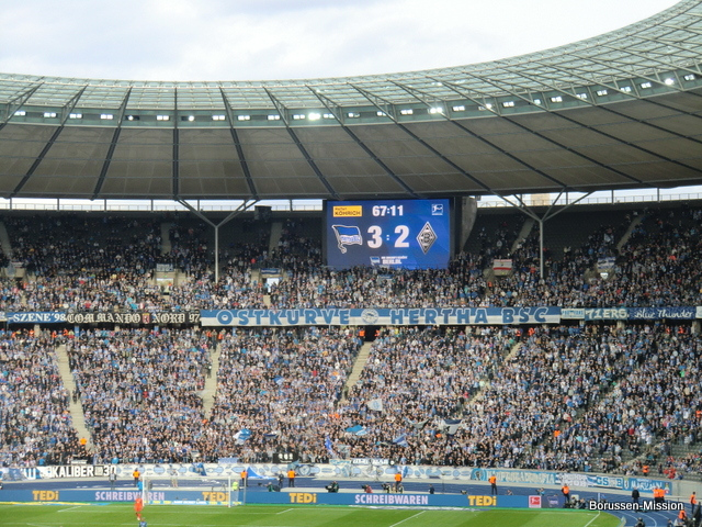 Am vierten Spieltag ging es für unsere ungeschlagene Fohlenelf in die Bundeshauptstadt zu den punkt- und torgleichen Fußballern der Alten Dame. Auf den Tag genau vor 12 Jahren kam es zu dem Zugunglück auf der Versuchsstrecke des Transrapids im Emsland mit 23 Toten und 10 Verletzten, aber daran erinnerte sich kaum ein Zuschauer an dem schönen sonnigen Samstag. Ziel war das Olympiastadion, welches 1934 bis 1936 für die olympischen Sommerspiele mit einem Fassungsvermögen von 100 000 Zuschauern errichtetet wurde und Teil des Olympiageländes ist. Der Verein selbst wurde ursprünglich am 25.Juli 1892 als reiner Fußballverein mit Namen Berliner Fußball Club Hertha 92 (BFC Hertha 92) gegründet, was heute nicht mehr der Fall ist. Einst im Arbeiterviertel Wedding beheimatet, wurde der Bezirk Gesundbrunnen die neue Heimat. 1923 erfolgte der Zusammenschluss mit dem noch heute bestehenden Verein Berliner Sport-Club zu Hertha BSC. Bereits 1930 trennten sich beide Vereine wieder, wobei der Name beibehalten wurde. Ein berühmtes Herthamitglied war der Wurzener Dichter Joachim Ringelnatz, der 1930 nach Berlin zog und von Auftritten lebte. Die 1933 an die Macht gekommenen Nationalsozialisten erteilten ihm Auftrittsverbote, worauf er verarmte und mittellos am 17.November 1934 an TBC starb, welche noch heute die weltweit tödlichste Infektionskrankheit ist. Sein Grab befindet sich auf dem Waldfriedhof Heerstraße in Stadionnähe. Nach dem zweiten Weltkrieg wurden bekanntlich alle deutschen Vereine aufgelöst und bis 1949 hieß der Verein „SG Gesundbrunnen“. Danach bekam der Verein seinen Namen zurück und ist ein Gründungsmitglied der Fußballbundesliga und trägt seit dieser Zeit seine Heimspiele im Olympiastadion aus. Die Bilanz unserer Fohlenelf gegen die Alte Dame könnten besser sein. So gab es bisher 65 Begegnungen, davon 34 in Berlin. Unsere Fohlen gingen in Berlin 10-mal als Sieger vom Platz, 5-mal trennte man sich Unentschieden und 19-mal blieben die Punkte. Mit gemischten Gefühlen reisten die Borussen individuell an und viele trafen sich in der Flatowallee bei preußischen Landwirtshaus. Anschließend ging es ins Stadion und die Banner fanden ein Plätzchen im Oberrang im zu 69 Prozent gefüllten Stadion, wobei man dazu schreiben muss, dass diese Zuschaueranzahl im Borussiapark ein zu 96 Prozent gefülltes Stadion in Mönchengladnach bedeutet.