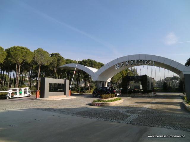 Für das Wintertrainingslager 2014 entschied sich die Vereinsführung von Borussia Mönchengladbach für das “MAXX ROYAL” an der türkischen Riviera in Belek, in dem vor 2 Jahren die Mannschaft des SV Werder Bremen untergebracht war. Am 11.Januar 2014 machten sich 2 Kyffhäuserfohlen, 3 Starke Sachsen, 4 Gessenthalfohlen, 4 Borussenfreunde und 19 Missionare aus den neuen Bundesländern auf den Weg zum Flughafen Leipzig/Halle. 8 von ihnen trafen sich in Aken und nach einer kurzen Begrüßung ging es gemeinsam mit den Taxibussen nach Leipzig. Problemlos erreichte man den Flughafen und nach der Ankunft begrüßte man weitere Reiseteilnehmer. Gemeinsam ging es zum Flughafenrestaurant „Tante Ju“, dort genoss man das Bier, den Glühwein und diverse Snacks, bis man vollzählig war. Geschlossen wurden die Koffer aufgegeben, aber individuell begaben sich alle zum Check-Inn. Einige ließen es sich auf den Weg dorthin nicht entgehen, an einer Weinverkostung teilzunehmen, anderen holten sich beim Bäcker noch etwas Süßes. Die Boeing 737-800 der Fluggesellschaft AirBerlin hob pünktlich ab und flog noch eine Schleife über Leipzig bevor es Richtung Antalya ging. Die Reisegruppe war über den Flieger verteilt und das Speisenangebot beinhaltete nur eine Schnitte mit Käse oder Wurst sowie alkoholfreie Getränke. Da man auf dem Weg in den Urlaub war, genehmigten sich viele Borussen die zu bezahlenden Getränke und nach etwa 3 Stunden setzte der Flieger sicher zur Landung in Antalya an. Nachdem alle ihr Reisegepäck hatten, ging es zum Schalter des Reiseanbieters und weiter zum bereitstehenden Bus. Dieses Jahr standen alle auf dem Zettel und der Busbegleiter „Heinrich“ begrüßte alle. Er erzählte ein paar Anekdoten und so verlief die halbe Stunde zum „VOYAGE Belek Golf&Spa“ recht kurzweilig. In Anbetracht der vorgeschrittenen Uhrzeit und der doch recht leeren Mägen ging es nach dem Empfang des Zimmerschlüssels gleich ins Restaurant. Gestärkt bezog man dann die Zimmer und frisch geduscht wurde die Hotelanlage mit ihren vielen Bars bis in die Morgenstunden erkundet.