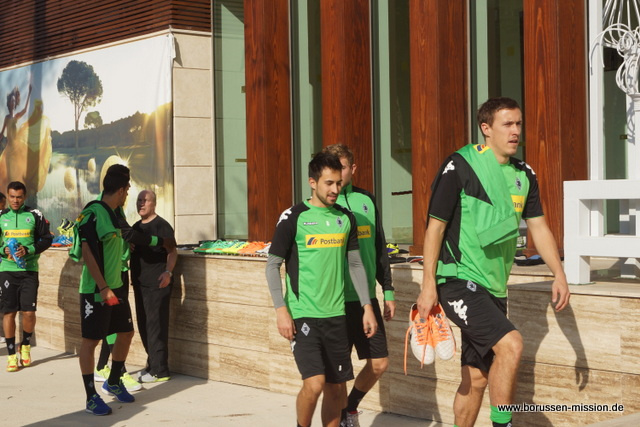 Wieder lockte das schöne Wetter nach dem Frühstück die einen zum Besuch der Trainingseinheit und die anderen zum Entspannen. Individuell verbrachte man den Tag bis zur Nachmittagstrainingseinheit. Diese war besser besucht als die am Vormittag, da ein gemeinsames Foto der mitgereisten Borussen mit der Mannschaft angekündigt war. Nach der Trainingseinheit wurden einige Zaunfelder geöffnet und man durfte zur Mannschaft auf den Rasen. Leider war zu dieser Zeit bereits die Sonne hinterm Horizont verschwunden und die Flutlichtanlage leuchtete das Gelände ungleichmäßig aus, so dass die Qualität der Fotos und des Gruppenfotos nicht die Beste ist. Dem Fotographen schwebte eine Raute als Motiv vor und die Beteiligten bemühten sich zwar, dies umzusetzen, aber wenn man in der Ebene steht und keine Markierung hat, fällt die Orientierung dazu schwerer. Wenn man dies weiß, kann man die Raute vielleicht erkennen. Zeit für ein kurzes Gespräch mit den Spielern blieb danach nicht mehr viel und so waren dann wenig später alle wieder in ihren Hotels und dort in den zahlreichen Lokalitäten verschwunden.