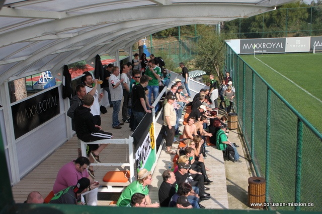 An diesem Morgen trafen sich nach dem Frühstück die Mitreisenden für Bannerfotos am Strand. Die Fanclubs und ihre Mitglieder wählten die türkische Riviera und das Hotel als Motiv dazu aus und am Ende gab es ein gemeinsames Foto. Die Ronneburger Gessenthalfohlen tauften anschließend ihr Banner im Mittelmeer und kühlten sich gleich noch ab. Einige Borussen inspizierten danach nochmal die Hotelanlage, bevor es am frühen Nachmittag auf das Gelände des Football Centers „CORNELIA DIAMOND“ zum Testspiel gegen Hertha BSC ging. Vor etwa 850 Zuschauern, darunter auch die Mannschaften von „Rote Brause“ Leipzig, IFK Göteborg sowie einige Spieler von der 2.Mannschaft der jüngeren Borussia. Das heutige Missionsgeburtstagskind erfreute sich über den 3:0 Sieg durch Tore von Armin Younes, Max Kruse und Peniel Mlapa. Leider musste es, nach einem harten Einsatz eines Herthaners mittels Ellenbogen, mit ansehen, wie Tony Jantschke mit Verdacht auf Jochbeinbruch früh das Spiel beendete. Zum Glück bestätigte sich die Diagnose später nicht, aber die zwei Knochenanbrüche sind auch schmerzhaft. Eine Kuriosität hatte das Spiel auch zu bieten, denn es endete vorzeitig. Der Linienrichter blieb plötzlich verletzt liegen und auch die Betreuer der Mannschaften konnten ihn nicht wieder fit machen. Was er genau hatte, entzieht sich unserer Kenntnis. Das Spiel wurde nach dieser Unterbrechung nicht wieder angepfiffen.